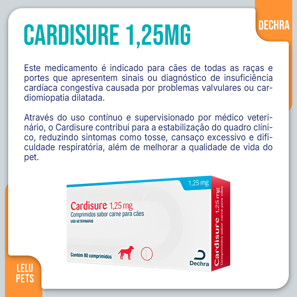 O Cardisure 1,25 mg Dechra é um medicamento desenvolvido para auxiliar no tratamento de insuficiência cardíaca em cães. Sua fórmula contém pimobendan, substância de ação comprovada que atua como inotrópico positivo e vasodilatador, contribuindo para melhorar a função do coração e a circulação sanguínea. Comprimidos palatáveis e de fácil administração, o Cardisure é indicado exclusivamente sob prescrição veterinária, garantindo segurança e eficácia no acompanhamento terapêutico de cães com doenças cardíacas. FICHA TÉCNICA Marca: Dechra Nome comercial: Cardisure Princípio ativo: Pimobendan Dosagem: 1,25 mg por comprimido Indicação: cães em tratamento de insuficiência cardíaca Apresentação: frasco com 80 comprimidos palatáveis Administração: via oral conforme orientação veterinária CUIDADOS COM O PRODUTO Uso exclusivo sob prescrição e acompanhamento veterinário Armazene em local fresco, seco e protegido da luz Mantenha fora do alcance de crianças e animais Não utilize em gatos ou em animais diferentes dos indicados Leia atentamente a bula antes do uso