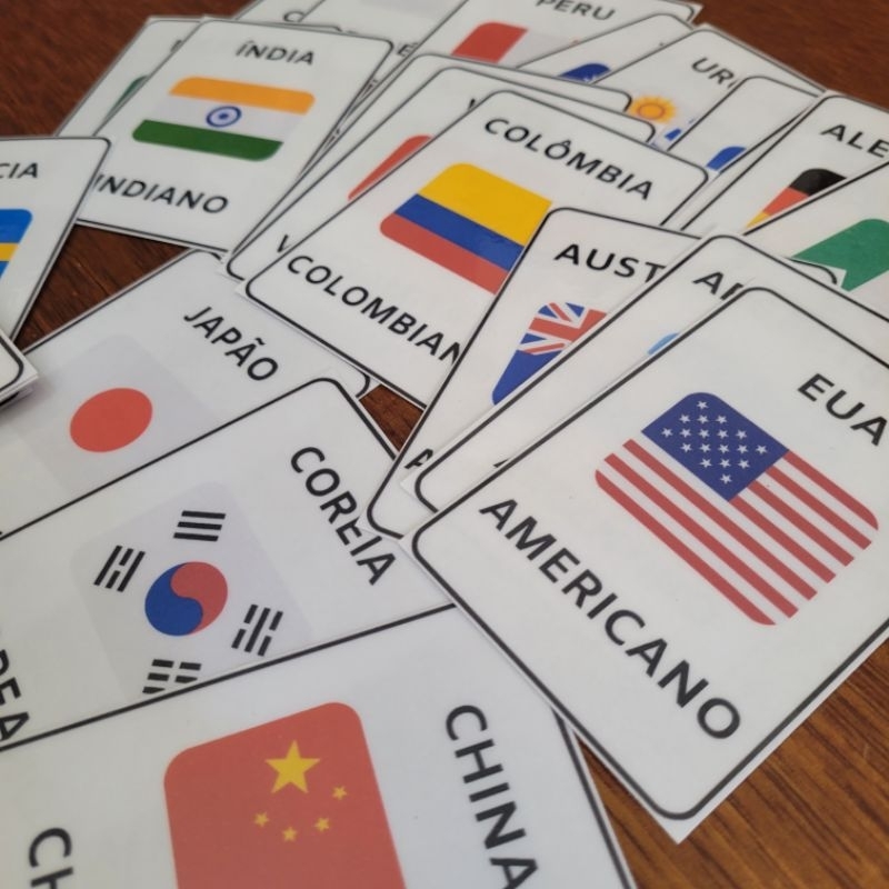 26 cartões plastificados Com a bandeira, país e nacionalidade Material: Papel plastificado