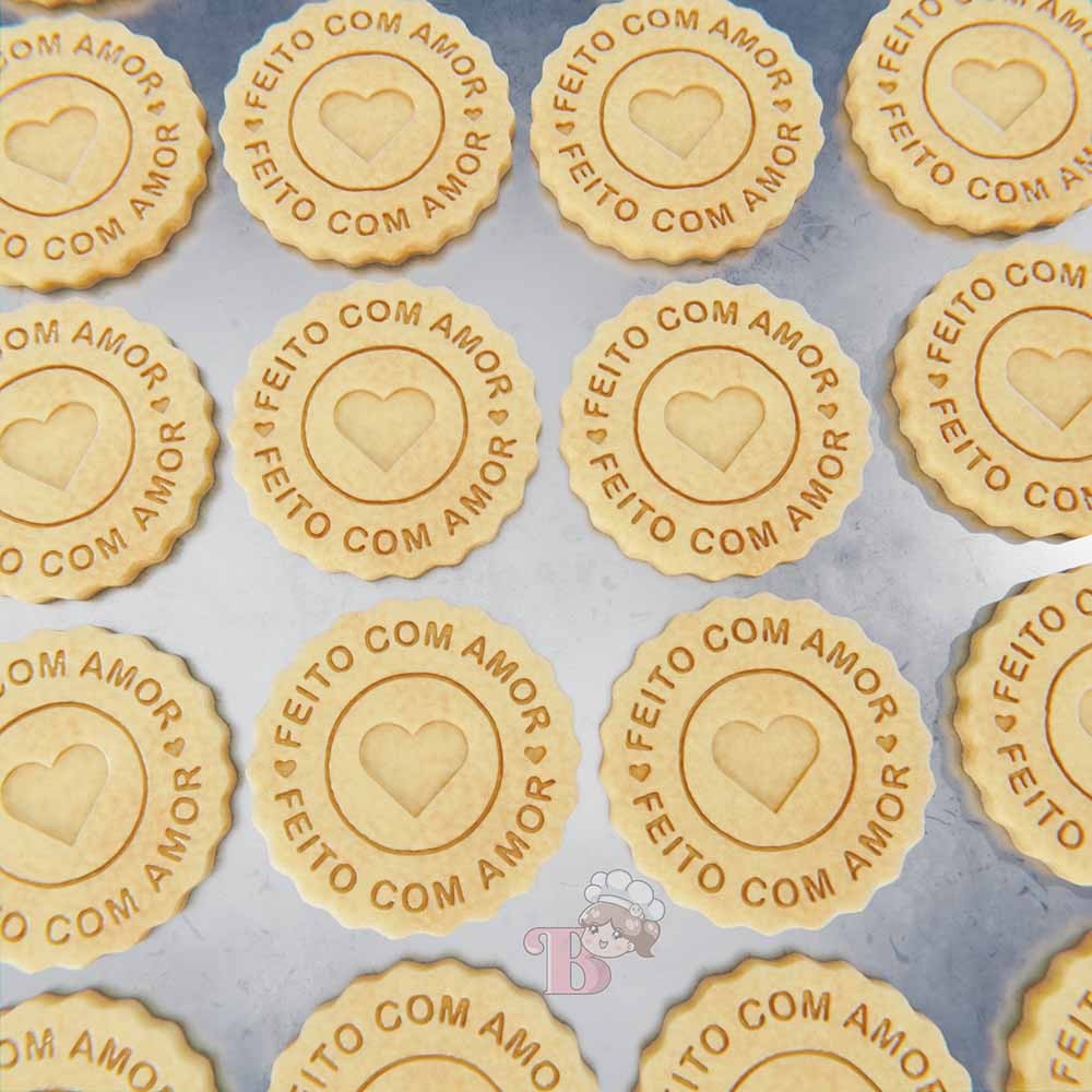 Carimbo + Cortador Feito com amor 2 Modelo de carimbo escrito: "Feito com Amor" com coração no meio. Características Conteúdo: 1 carimbo + 1 cortador Tamanho: 5 cm (maior lado) Todos os carimbos vão com puxador na parte de trás, facilitando o seu manuseio Material Nossos cortadores e carimbos são fabricados de plástico PLA, um plástico resistente e biodegradável - não agride o meio ambiente e pode ter contato com alimentos. Como utilizar Os cortadores são as peças mais altas que dão formato ao seu biscoito. Após pressioná-lo contra a massa aberta vai ser feito um corte no formato do cortador. Já os carimbos são utilizados para marcar, que após pressionados sobre a massa dão o formato desejado na mesma. Utilize nossos produtos em uma variedade de massas: biscoito pasta americana biscuit massas de bolo massas de pão Manuseio e precauções Não leve os produtos ao forno, pois são sensíveis a altas temperaturas! Lave sempre com sabão neutro Utilize uma escova de cerdas macias para limpá-los Ao cortar e carimbar, procure utilizar farinha ou similar para evitar que a massa grude nos carimbos Produção e envio Para informações sobre os prazos de produção e envio, consulte a página Envio. Personalização Não encontrou o que precisa? A gente resolve! Produzimos o seu desenho de forma personalizada no tamanho de sua escolha, entre em contato.
