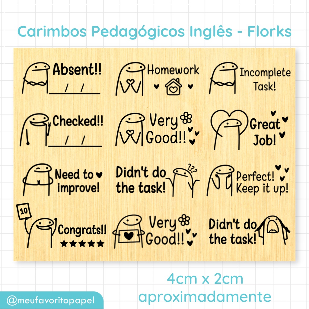 Carimbo Pedagógico INGLÊS Flork Meme - Carimbo Escolar Infantil para Professores 4cm
