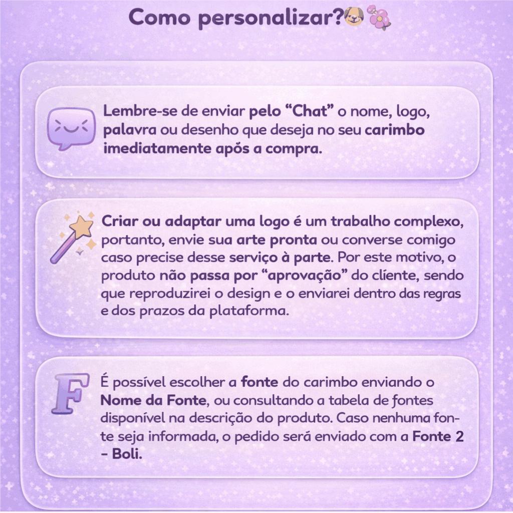 📌 Personalização do seu carimbo Após a compra, envie imediatamente pelo chat o nome, logo ou desenho que deseja no carimbo. O carimbo é produzido e postado em até 24 horas úteis, por isso não é possível aguardar contato posterior. Caso tenha dúvidas, fale com o vendedor antes da compra. 🔤 Fonte (estilo da letra) Você pode escolher a fonte enviando uma imagem de referência ou selecionando pela tabela disponível nas fotos do produto. Caso não informe, será utilizada a fonte mais adequada para o carimbo em questão. 🖼️ Logos e desenhos O carimbo possui apenas 2 cm de diâmetro, então a arte deve ser simples e legível nesse tamanho. Evite imagens com muitos detalhes ou letras muito pequenas e finas, pois podem comprometer o resultado final. Carimbos para personalizar suas criações de forma prática rápida e criativa. Nossos produtos 3D são produzidos com PLA, um material inovador, sustentável e biodegradável. Diferente de plásticos tradicionais derivados do petróleo, o PLA é feito a partir de fontes renováveis, como o amido de milho e a cana-de-açúcar, tornando-se uma escolha segura para uso em produtos alimentares e ecologicamente responsável para personalizar suas criações. Especificações: Comprimento Total: 3,3 cm Desenho: 2 cm Base: 2,8 cm x 1,5 cm Profundidade: 0,5 cm Cuidados com o produto: -Utilize escova de cerdas macias para higienização; -Lave apenas com água fria e detergente neutro. -Não utilizar em temperatura acima de 40 Grau Celsius pode danificar o produto. Envio e garantia: Postamos o pedido em até 24 horas corridas após a aprovação do pagamento. Compras em fins de semana e feriados são enviadas no próximo dia útil. Enviamos para todo o Brasil com garantia contra qualquer problema. Os produtos seguem em embalagem reforçada para chegar intactos e sem danos!