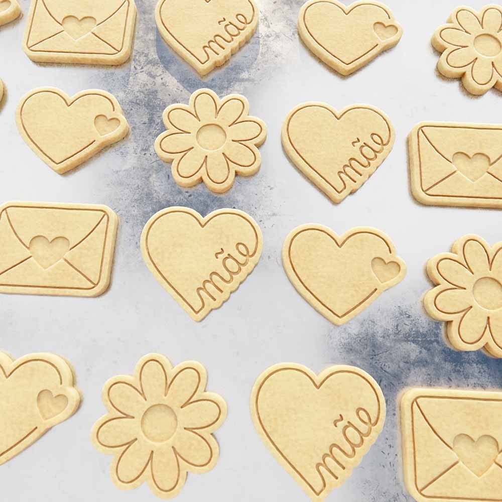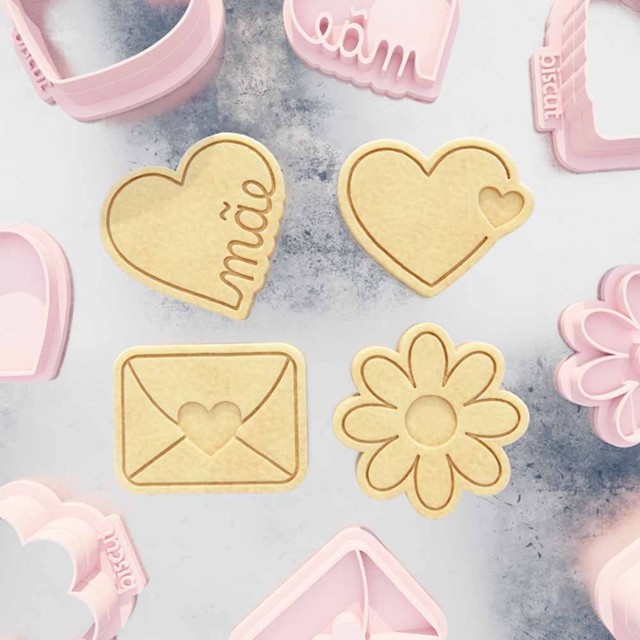 Carimbos + Cortadores Kit dia das mães 03 Para esse dia das mães, nada mais criativo do que esses lindos modelos para o dia das mães! Cartinha, Flor e 2 corações Características Conteúdo: 4 carimbos + 4 cortadores Tamanho: 5 cm (maior lado) Todos os carimbos vão com puxador na parte de trás, facilitando o seu manuseio Material Nossos cortadores e carimbos são fabricados de plástico PLA, um plástico resistente e biodegradável - não agride o meio ambiente e pode ter contato com alimentos. Como utilizar Os cortadores são as peças mais altas que dão formato ao seu biscoito. Após pressioná-lo contra a massa aberta vai ser feito um corte no formato do cortador. Já os carimbos são utilizados para marcar, que após pressionados sobre a massa dão o formato desejado na mesma. Utilize nossos produtos em uma variedade de massas: biscoito pasta americana biscuit massas de bolo massas de pão Manuseio e precauções Não leve os produtos ao forno, pois são sensíveis a altas temperaturas! Lave sempre com sabão neutro Utilize uma escova de cerdas macias para limpá-los Ao cortar e carimbar, procure utilizar farinha ou similar para evitar que a massa grude nos carimbos Produção e envio Para informações sobre os prazos de produção e envio, consulte a página Envio. Personalização Não encontrou o que precisa? A gente resolve! Produzimos o seu desenho de forma personalizada no tamanho de sua escolha, entre em contato.