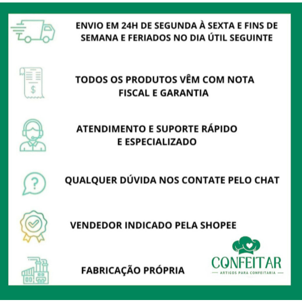 Para encantar ainda mais seus clientes e convidados, oferecemos a você o kit de carimbos para docinhos e brigadeiros uma forma divertida e inovadora de personalizar os seus produtos. Produzido utilizando modernas técnicas de impressão 3D, nossos produtos são confeccionados utilizando material biodegradável (PLA) produzido a partir do processamento de milho de alta qualidade. Kit com 5 carimbos tema bosque encantado Tamanho aproximado do desenho: 1cm a 1,5cm Tamanho das bases: 3,5cm x 1,5cm Profundidade do desenho: 0,5cm Indicado para docinhos de 12 a 18 gramas. Ideais para brigadeiros, os carimbos também podem ser utilizados em pasta americana, pasta de leite em pó, biscuit e outras massas similares. Instruções de uso: Os carimbos não deverão ser expostos a temperatura superior a 40°. Para limpar utilizar água corrente e detergente neutro. Cor: Não possui uma cor específica, será enviado a que estiver disponível no estoque. Possuímos diversos modelos de carimbos e cortadores para docinhos, massa americana e biscuit, além de produzirmos moldes personalizados de chocolate, verifique na nossa loja.