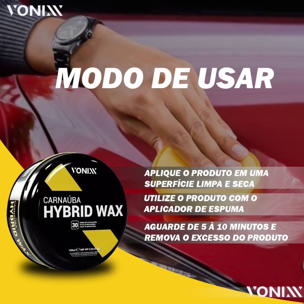 Carnaúba Hybrid Wax é uma cera desenvolvida com a mais pura carnaúba cearense e polímeros de última geração, que protegem e dão brilho por um longo perído Diluição : Pronto uso Durabilidade : Até quatro meses de proteção na pintura do veículo Informações adicionais : Carnaúba Hybrid Wax pode ser aplicada em qualquer cor de pintura. Para a sua manutenção, sugerimos o uso das ceras Carnaúba Tok Final, Blend Spray ou Native Spray. Não aplicar o produto em plásticos ou borrachas. -Brilho impecável -Super proteção -Rende até 60 aplicações MODO DE USAR: 1. Aplicar o produto em pequena quantidade na pintura limpa e seca 2. Utilizar o aplicador incluso na embalagem e realizar a aplicação com movimentos uniformes 3. Aguardar entre 5 e 10 minutos e remover o produto utilizando toalha de microfibra até obter o brilho desejado. - Não nos responsabilizamos pela má instalação ou mau uso do produto, faça a instalação com profissionais especializados. - Atenção: As compras realizadas em nome de Pessoa Jurídica estão sujeitas a cobrança de ICMS, conforme Protocolo ICMS 41, de 4 de Abril de 2008. Caso você tenha dúvidas sobre o percentual a ser aplicado, consulte a Cláusula Segunda, §1° do referido Protocolo. - Em caso de dúvidas use o campo de Perguntas. Fotos meramente Ilustrativas. Caso tenha dúvidas quanto a utilização deste produto, favor consulte-nos pelo campo de perguntas. CÓD. REFERÊNCIA: 016418
