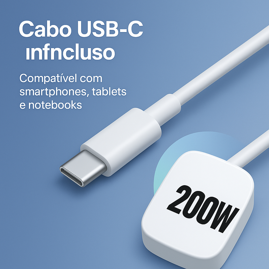 Certamente! Um carregador de 200W é um dispositivo de alta potência projetado para carregar diversos tipos de equipamentos eletrônicos de forma rápida e eficiente. Vamos explorar todos os detalhes deste carregador robusto e suas características principais. Design e Construção O carregador de 200W geralmente apresenta um design compacto e robusto, com uma estrutura sólida e materiais resistentes. É projetado para ser portátil, permitindo fácil transporte e uso em diferentes ambientes, desde residências até escritórios e viagens. Capacidade e Potência A característica mais impressionante deste carregador é sua capacidade de fornecer até 200 watts de potência. Isso o torna extremamente versátil, adequado para carregar uma ampla gama de dispositivos eletrônicos, desde smartphones e tablets até laptops e dispositivos de realidade virtual. Portas de Carregamento Normalmente, um carregador de 200W possui múltiplas portas de carregamento para permitir o carregamento simultâneo de vários dispositivos. Estas portas podem incluir: USB-A: Portas padrão USB para dispositivos mais antigos ou que não requerem alta potência. USB-C PD (Power Delivery): Portas USB-C com suporte a Power Delivery, capazes de fornecer alta potência para carregar laptops e outros dispositivos exigentes. Portas AC: Alguns modelos podem incluir portas de tomada AC integradas, permitindo o carregamento direto de dispositivos que normalmente requerem uma tomada de parede. Compatibilidade O carregador de 200W é projetado para ser altamente compatível com uma variedade de marcas e modelos de dispositivos eletrônicos. Ele pode carregar smartphones de todas as principais marcas, tablets como iPads e dispositivos Android, além de laptops de várias marcas, como MacBook, Dell, Lenovo e outros que suportam carregamento via USB-C PD. Segurança e Eficiência Energética Para garantir a segurança durante o uso, este tipo de carregador geralmente vem com proteções contra sobrecarga, superaquecimento, curto-circuito e picos de tensão. Além disso, muitos modelos são projetados para serem energeticamente eficientes, minimizando perdas de energia e ajudando a reduzir o impacto ambiental. Indicadores e Controles Alguns carregadores de alta potência podem incluir indicadores LED para mostrar o status de carga de cada porta. Isso ajuda os usuários a monitorar facilmente o progresso do carregamento sem precisar verificar individualmente cada dispositivo. Uso e Aplicações Devido à sua capacidade de alta potência, o carregador de 200W é ideal para uma variedade de situações: Uso doméstico: Carregar múltiplos dispositivos eletrônicos em casa, evitando a necessidade de vários adaptadores e tomadas. Viagens: Minimizar a quantidade de carregadores necessários na bagagem, sendo capaz de carregar tanto dispositivos pequenos quanto laptops durante viagens. Ambientes profissionais: Ideal para ambientes de trabalho onde vários dispositivos precisam ser carregados simultaneamente, como escritórios, estúdios e salas de conferência. Conclusão Em resumo, um carregador de 200W é uma escolha excelente para quem busca conveniência, eficiência e desempenho elevado ao carregar seus dispositivos eletrônicos. Com sua capacidade de carregar uma ampla gama de dispositivos rapidamente e com segurança, representa uma solução moderna e eficaz para as necessidades de carregamento contemporâneas.