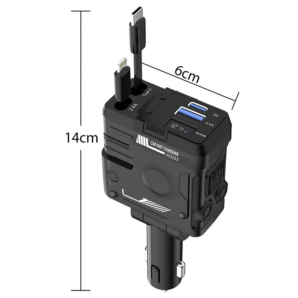 Projetado para veículos 12V a 24V, este carregador é perfeito tanto para carros quanto caminhões, entregando até 120W de potência total, garantindo carregamento rápido e eficiente mesmo para dispositivos mais exigentes. Carregue até 4 dispositivos simultaneamente sem perda de desempenho. Tudo o que você precisa em um único produto 2 cabos retráteis integrados Tipo-C (USB-C) Lightning (iOS) 2 portas adicionais USB-C (até 3A) USB-A (até 2.4A) Chega de carregar vários cabos soltos no carro. Tudo fica integrado, organizado e sempre à mão. Os cabos retráteis são super inteligentes. Possuem rebobinamento automático, com até 75 cm de extensão. Puxe apenas o necessário e solte para que o cabo retorne suavemente ao compartimento interno, evitando nós, bagunça e desgaste. Resultado: interior do carro limpo, moderno e funcional. Combinação de Carregamento Turbo + Tecnologia Avançada Porta USB-C com alta eficiência (até 66W) Porta USB-A de carregamento rápido (até 20W) Compatível com smartphones, tablets, GPS, fones, power banks e muito mais Visor Digital Inteligente e controle em Tempo Real O visor digital integrado exibe a voltagem da bateria do veículo em tempo real, permitindo: Monitorar a saúde da bateria Evitar surpresas desagradáveis Mais segurança para você e seu veículo Equipado com chips inteligentes de última geração, oferece múltiplas camadas de proteção: Proteção contra sobrecarga Sobrecorrente Sobretensão Curto-circuito Controle de temperatura Seu carro e seus dispositivos sempre protegidos. Características Cor: Preto Material: Abs+Componentes eletronicos Potencia Total: 120w Potência Máxima do produto: 66w Tensão de entrada: 12-24v 2 cabos retráteis integrados (USB-C e Lightning) 2 portas adicionais (USB-C e USB-A) Carregamento rápido: Até 4 dispositivos simultâneos Visor digital com exibição de voltagem Plugue ajustável em 180° Design Moderno Compacto Ajustável 4 Em 1 Dimensões Aproximadas Altura: 14cm Largura: 6cm Espessura: 3cm Comprimento máximo do cabo: 75cm Conteúdo da Embalagem 1 Carregador veicular turbo com cabos integrados 3 Meses de Garantia Contra Defeito de Fabricação. **126g Mod: SU-RET2
