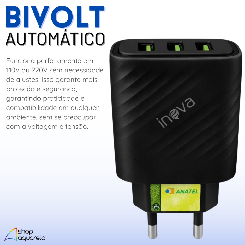 Se você busca praticidade e eficiência no carregamento dos seus dispositivos, a Fonte Carregador Rápido Inova CAR-3248F é a escolha ideal. Com três portas USB e potência de 5.1A, ela permite carregar até três aparelhos ao mesmo tempo com segurança e rapidez. Compatível com diversos modelos de smartphones, tablets e outros dispositivos USB, é perfeita para uso em casa, no escritório ou em viagens. Por que escolher este modelo? • 3 portas USB para carregamento simultâneo • Potência total de 5.1A para recarga ultrarrápida • Tecnologia de proteção contra sobrecarga e superaquecimento • Bivolt automático (110V/220V), ideal para qualquer lugar • Compacto, leve e fácil de transportar • Compatível com smartphones Android, iPhone, tablets e outros dispositivos USB O que acompanha o produto? 1 Fonte Carregador Rápido Inova CAR-3248F Preta Especificações Técnicas • Marca: Inova • Modelo: CAR-3248F • Conexões: 3 portas USB • Potência: 5.1A (25.5W máx.) • Entrada: Bivolt automático 100-240V • Saída: 5V / 5.1A total • Cor: Branco • Material: ABS resistente Dúvidas Frequentes • Posso carregar três aparelhos ao mesmo tempo? Sim, a fonte possui 3 portas USB e suporta carregamento simultâneo. • Funciona em tomada 220V? Sim, é bivolt automático (110V/220V). • Pode ser usada em iPhone? Sim, é compatível com qualquer aparelho que utilize cabo USB. Produto novo, original, com nota fiscal e envio imediato.