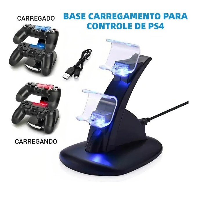 O suporte carregador duplo para controles é compatível com os modelos Ps4, Ps4 Slim & Pro. Com cabo usb / micro carregamento pela parte de cima do controle(entrada micro). Carregue 2 controles simultaneamente e não fique mais sem bateria em seus controles na hora dos jogos. CARACTERÍSTICAS - Base Carregadora Dupla ( Carrega 2 controles ao mesmo tempo ) - Materiais de alta qualidade usados na fabricação - Compatível com: Controle Dualshock 4 ( PS4, Ps4 Slim, Ps4 Pro ) - Recarregue através da porta Usb do Playstation ou qualquer outra porta Usb. ESPECIFICAÇÕES: - Tempo de carga: 2 horas Itens Inclusos: - 01 Base Carregador Duplo para Dualshock 4 - PS4, Ps4 Slim, Ps4 Pro. - 01 Cabo Usb para alimentação * Não acompanha os controles