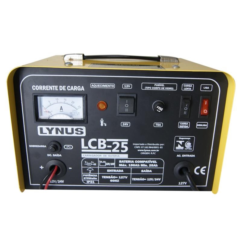 Indicado para carregar todos os tipos de baterias, o carregado de baterias LYNUS, possuí aviso luminoso de super aquecimento e fusível de entrada que proporciona maior grau de proteção aos usuários de nosso equipamento. Produto certificado conforme Portaria Inmetro n° 371/2009 por ABNT OCP 0005. DADOS TÉCNICOS Bateria compatível (Ah): 25-150 Classe de isolamento: H Grau de proteção: IP20 Códigos: 127V - 5388.4 Corrente nominal (A): 10 Peso (kgf): 5,6 Potência nominal de carga (W): 240/360 Tensão (V): 127 ou 220 Voltagem da carga (V): 12 / 24