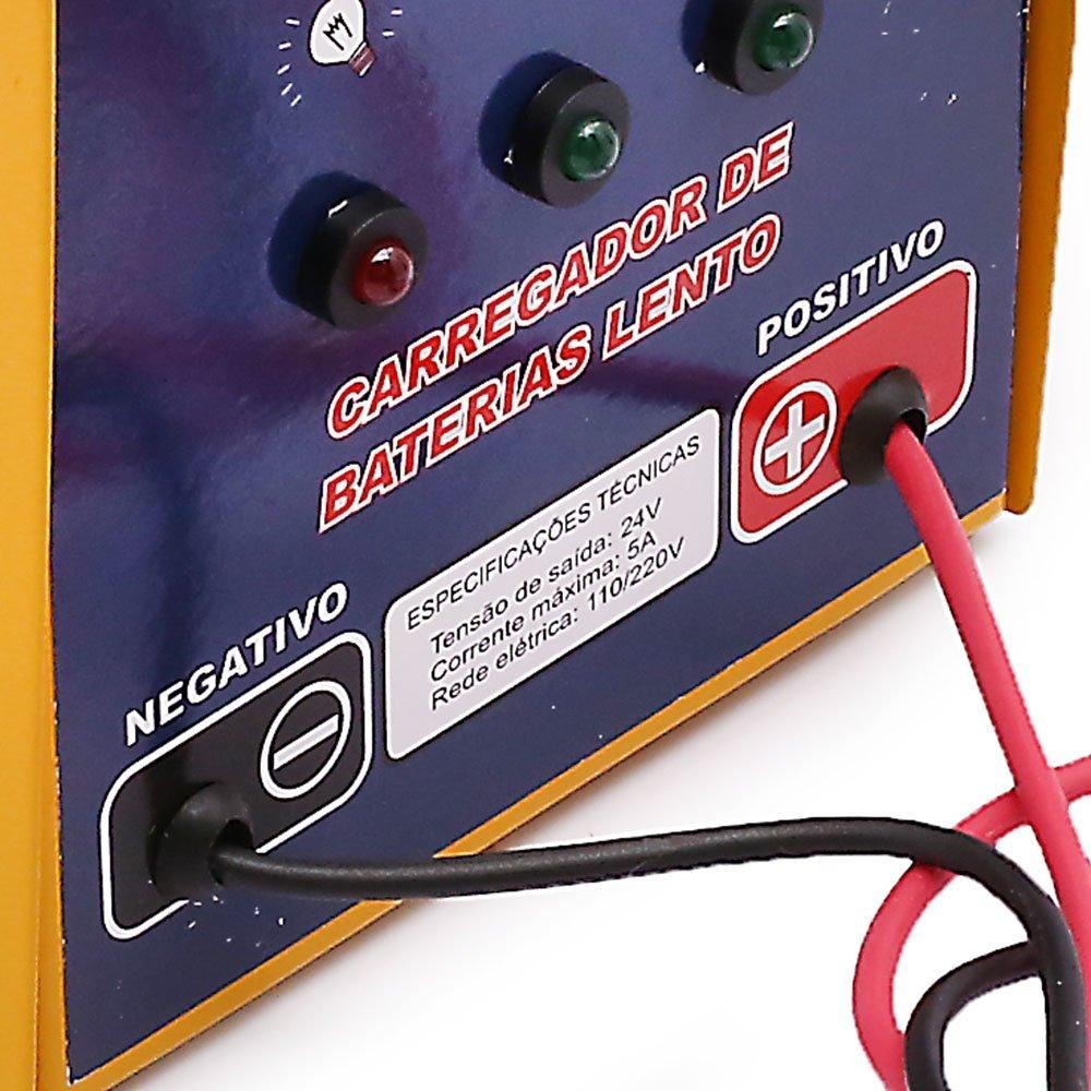 O carregador de bateria portátil muito utilizado em oficinas mecânicas e auto elétricas para recarregar, recuperar e proteger a bateria. Tem capacidade nominal para recarga de até 12V, permitindo o carregamento de uma bateria por vez. Caso for carregar duas baterias 12V em série, deve mudar o seletor de saída em 24V. Tudo isso para oferecer comodidade e tranquilidade quando se trata de bateria. Podem ser utilizado em carros, motos, sistema de alarme e jetski. - Características: :: Um equipamento automotivo :: Carregador portátil :: Possui indicadores luminosos :: Cabo positivo/negativo :: Plug da rede elétrica: o aparelho é ligado automaticamente após este plug ser conectado a tomada :: Porta fusível e fusível de vidro de 10A 250V 20AGF :: Seletor de energia elétrica 110V ou 220V :: Ideal para o uso em carros, motos, sistema de alarme e jetski - Especificações Técnicas: - Leitura automática das baterias - Corrente máxima: 5A - Tensão: 110V ou 220V # ATENÇÃO - Respeite sempre a capacidade do aparelho que é no máximo 1 bateria 12V até 45/h por ver ou 2 baterias de 12V em série - Garantia: 6 Meses - Marca: KITEC