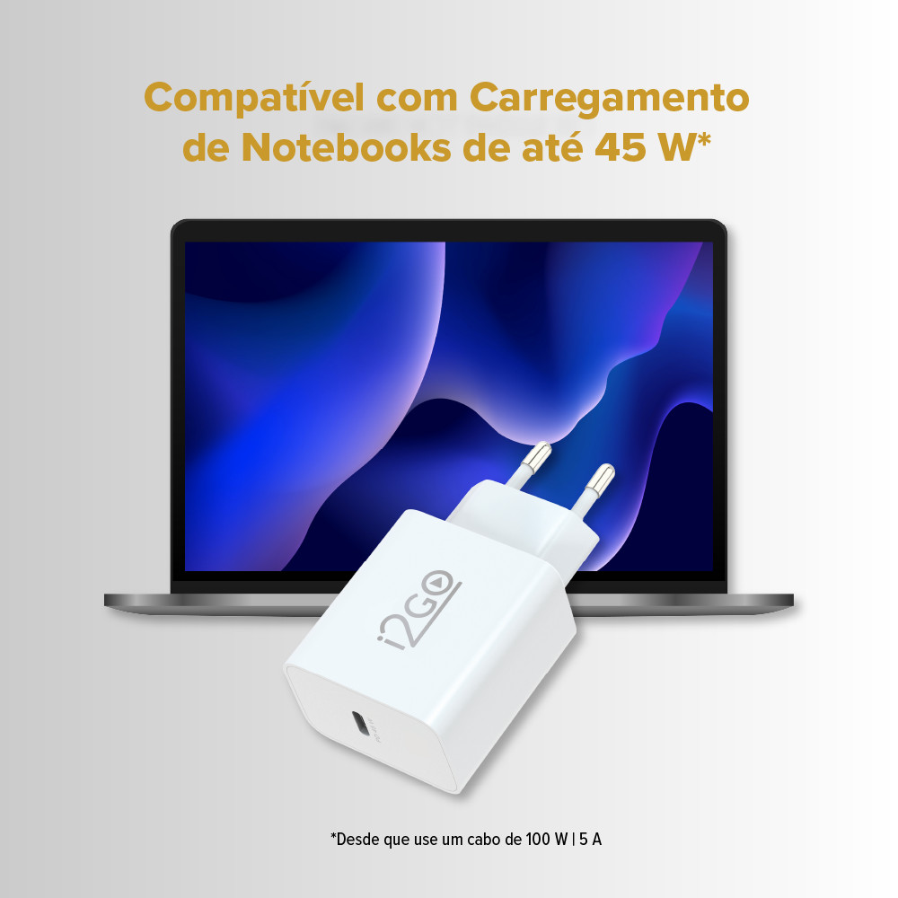 O Carregador de Parede Ultra Charger 45 W da i2GO é a solução ideal para quem busca carregamento rápido e seguro. Com tecnologia Power Delivery de 45 W, ele carrega 50% da bateria em apenas 18 minutos, oferecendo eficiência tanto para smartphones quanto para notebooks compatíveis, garantindo versatilidade em todas as situações. Equipado com o sistema Multi Protect, ele oferece proteção integrada contra sobretensão, sobrecorrente e superaquecimento, utilizando chips inteligentes de última geração para manter seus dispositivos sempre seguros durante o carregamento. Além do desempenho, o Ultra Charger 45 W destaca-se pelo design compacto e leve, ideal para transportar em viagens ou no dia a dia, sem ocupar muito espaço. Com saída USB-C, ele proporciona carregamento veloz e confiável, tornando-se indispensável para quem precisa de agilidade e segurança ao recarregar seus dispositivos. Power Delivery 45 W – Carregamento ultrarrápido: Carrega 50% da bateria do smartphone em apenas 18 minutos! Ideal para quem tem uma rotina intensa e precisa de energia rápida. Compatibilidade Universal: Perfeito para usuários de dispositivos USB-C, incluindo notebooks compatíveis com PD 45 W. Uma solução completa em um único carregador. Multi Protect System – Segurança garantida: Proteção avançada contra sobretensão, sobrecorrente e superaquecimento, oferecendo máxima segurança em cada carga. Design Versátil: Compacto e leve: Fácil de transportar no bolso ou na bolsa, ideal para viagens e uso no dia a dia. Especificações Técnicas: Material: ABS+PC. Carregador: 45W PD. Entrada: AC 100-240V 50-60Hz 1.2A. Tipo de saída C (45W PD): DC 5V/3A, 9V/3A, 12V/3A, 15V/3A, 20V/2.25A. Support: Smartphone PD. Plug: EU (cobre). Proteção: Proteção contra sobrecarga/descarga excessiva, proteção contra sobrecorrente/curto-circuito. Certificação: ROHS, FCC, CE standard. Peso: 65.5g. *Garantia i2GO: Esse produto está garantido contra defeitos de fabricação por 1 ano. Para ativar 2 anos mais (3 anos no total), registre seu produto em nosso site.