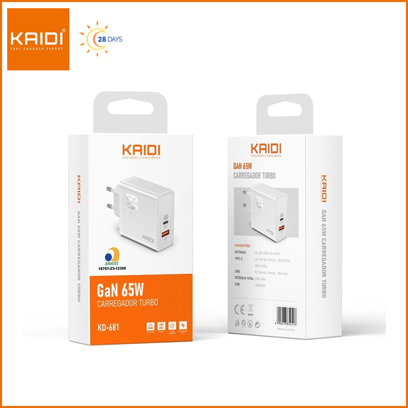 Carregador de Tomada Fonte de Carregamento Turbo 65w com entrada Tipo-C e USB KAIDI KD-681