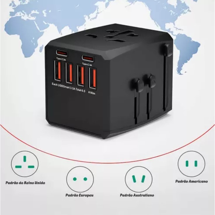 Carregador de viagem com Adaptador Universal Internacional Carga Rápida 30w/36w 150 Países saída USB/TIPOC
