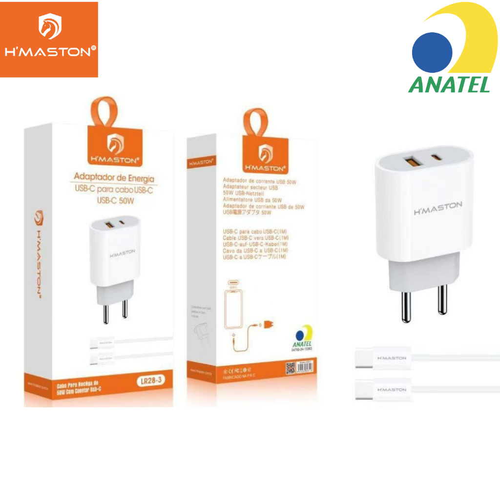 Carregador Fonte e cabo Carga Rápida 50w Original H"Maston USB + USB-C | iPhone LR28-2/LR28-3 🔌 Carregador Turbo H'Maston 50W – LR28-2 & LR28-3 🔋 ⚡ Potência de verdade com versatilidade para diferentes dispositivos! Chega de dor de cabeça com carregadores limitados! O H'Maston 50W foi feito para resolver problemas reais do dia a dia, como: 🚫 Só tem uma entrada no carregador, mas precisa carregar dois aparelhos? 🚫 Seu cabo só funciona na saída USB-C e o carregador só tem USB tradicional? 🚫 Aparelho com carregamento rápido, mas o carregador é lento ou incompatível? 👉 Com 2 saídas (USB-C + USB-A) e potência de até 50W, o H'Maston LR28 resolve tudo isso. Compatível com vários tipos de cabos e aparelhos, ele oferece flexibilidade total, seja qual for o dispositivo. ✅ Modelo LR28-2 – USB-C para Lightning • Ideal para iPhones e dispositivos com entrada Lightning • 2 portas: USB-C + USB-A – use ambas ao mesmo tempo! • Acompanha cabo USB-C para Lightning (1 metro) • Homologado pela ANATEL 📦 Conteúdo da Embalagem – LR28-2: • 1x Carregador Turbo 50W • 1x Cabo USB-C para Lightning (1m) • 1x Manual do Usuário ✅ Modelo LR28-3 – USB-C para Tipo-C • Perfeito para Androids, tablets e dispositivos com entrada Tipo-C • Suporta PD (Power Delivery) – carregamento ultra-rápido • Acompanha cabo USB-C para USB-C (1 metro) • 2 portas: USB-C + USB-A – carregue dois aparelhos diferentes de uma só vez 📦 Conteúdo da Embalagem – LR28-3: • 1x Carregador Turbo 50W • 1x Cabo USB-C para Tipo-C (1m) • 1x Manual do Usuário 🔒 Proteção contra sobrecarga e superaquecimento 🧳 Design compacto, perfeito para viagens ⚡ Compatível com múltiplos dispositivos e cabos 💡 Ideal para quem não quer depender de um único padrão de entrada/saída