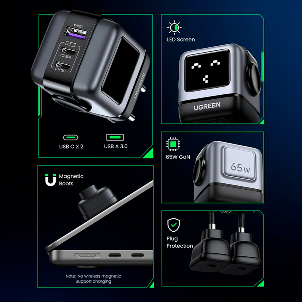 Carregador Parede Ugreen 65W Nexode Porta Usb A/C Preto, Carregamento Rápido, Design Robô, Ampla Compatibilidade 1. Suporte a Carregamento Rápido de 65W: O carregador Ugreen Nexode oferece até 65W de potência, permitindo carregamento rápido de diversos dispositivos. Ideal para smartphones, tablets, laptops e outros dispositivos que suportam carregamento rápido, ele garante que você economize tempo enquanto mantém seus dispositivos sempre prontos para uso. 2. Múltiplas Portas para Conveniência: Equipado com 1 porta USB-A e 2 portas USB-C, o carregador oferece versatilidade e eficiência para carregar até três dispositivos simultaneamente. Suas portas USB-C são perfeitas para dispositivos modernos, enquanto a porta USB-A garante compatibilidade com aparelhos mais antigos, proporcionando flexibilidade total. 3. Com tecnologia de ponta e proteção integrada contra surtos e curtos-circuitos, o carregador Ugreen Nexode oferece segurança máxima, garantindo um carregamento confiável para todos os seus dispositivos, seja em casa, no trabalho ou em viagens. 4. Projetado para ser compacto e portátil, o Ugreen Nexode é perfeito para quem está sempre em movimento. Seu design leve e compacto facilita o transporte em viagens ou uso diário, garantindo que você possa carregar todos os seus dispositivos com rapidez e segurança onde quer que esteja. 5. Sistema de segurança múltipla: A proteção contra curto-circuitos incorporada, a proteção contra sobrecargas, a proteção contra sobretemperatura e a proteção contra picos de tensão estão prontas para uma segurança integral. Garantia 90 dias