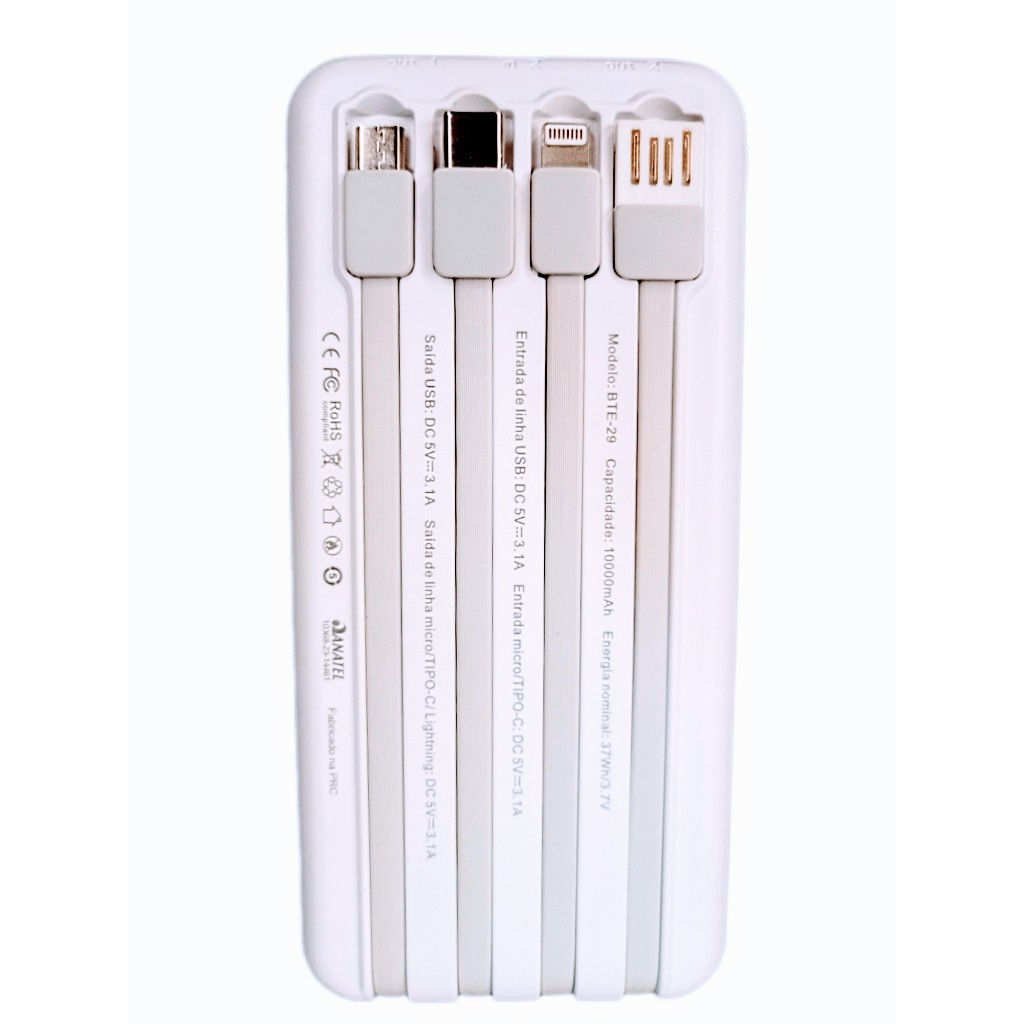 Power Bank Carregador Portátil A'Gold Bte-29 10000mAh 4 cabos embutidos: Lightning (IPhone), Tipo-C, Micro USB (V8), e cabo USB para próprio carregamento do carregador portátil.*CERTIFICAÇÃO ANATEL, assegurando que foi testado e aprovado para uso no Brasil, diferenciado perante outros carregadores de outras marcas. *Cabo de carregamento já embutido no próprio corpo do PowerBank. *Ciente que ao carregar um dispositivo móvel (celulares, tablets, caixas de som portáteis) e continuar usando esses dispositivos ao mesmo tempo vai diminuir a eficiência final do carregamento do dispositivo, porém não existe contra-indicação para se fazer isso, aliás essa é uma das vantagens de utilizar um carregador portátil. Cor: PRETO Bateria Externa para Smartphones, Celulares, Sony, Samsung Galaxy, Motorola, Ipad, IPhone, Controle de Video Game, Tablets, MP3, GO Pro, e todos os eletrônicos que recebem energia via micro USB, Lightining e Tipo-C.Compatível com os 3 tipos de conexão: Lightning (Iphone), Tipo-C e Micro USB (V8).Ideal para levar a qualquer lugar e não ficar sem bateria no seu Celular, Caixa de Som, Tablet, Câmera dentre outros: - 1 a 2 Cargas Completas para tablets - 2 a 3 Cargas Completas para celulares - Chip de reconhecimento de tensão inteligente detecta automaticamente a tensão. - Construído com proteção da bateria IC para evitar o excesso de carga, descarregamento e curto-circuito. - Super fácil de usar, basta conectar e carregará seu dispositivo. - Design Moderno, texturizado, não escorrega da mãe, leve, ótimo acabamento -Todos cabos embutidos, não se preocupe em carregar cabos. - 3 formas de carregar seu carregador portátil BTE-29: Através do próprio cabo USB já embutido conectando em qualquer saída USB comum, através de entrada Tipo-C ou Micro USB Especificações: 1. Entradas: USB (cabo já embutido), Portas Micro USB e Tipo-C, DC 5V/3.1A2. Saidas: Lightning (Iphone), Tipo-C, Micro USB (Cabos Embutidos), Porta USB DC5V 3.1A3. Capacidade da Bateria Interna: 3.7V/10000mAh 37wh 4. Saída Avaliada: 6700mAh = 31.5Wh 5. Tipo de Bateria Interna: Polímero de Lítio 6. Tempo Carregamento do Power Bank: 5-6 horas 7. Temperatura em Trabalho: -10°C to 45°C 8. Tempo de Espera: & gt; 5000hrs 10. Peso: 228g 11. Tamanho: 156*77*15mm. Cor: Preto. Características: 1. Com display de 4 Leds indicadores luminosos de quantidade de carga e pisca quando está sendo carregado.2. Liga e Desliga automaticamente, basta conectar ou desconectar de outros dispositivos.3. Usa bateria de polímero de lítio para torná-lo mais fino (slim).4. Compatível para qualquer telefone, tablet, MP3, MP4, PSP, GPS, dispositivo de jogos, câmera e muitos mais (basta conectar com o cabo e conectores inclusos). 5. Chip de reconhecimento de tensão inteligente detecta automaticamente a tensão. 6. Construído em proteção da bateria IC para evitar o excesso de carga, o descarregamento e curto-circuito.7. Todos cabos totalmente embutidos8. Botão de ligar para checar os leds indicadores de carga. R: Assim que seu pedido for despachado, a plataforma envia para você o código de rastreamento. R: O tempo de entrega irá depender totalmente do seu CEP.R: Iremos despachar o seu produto o mais rápido possível, assim que for confirmado pra gente pela plataforma, em até 24h entregamos para envio. R: Com certeza! A própria Shopee te garante isso, e se caso algum dia a Shopee falhar com você, pode ter certeza que nós queremos a sua satisfação, qualquer problema iremos te auxiliar. Temos um suporte de 09:00 às 18:00 de segunda a sábado pronto para te atender da melhor forma possível! Por favor entre em contato conosco caso precise de ajuda através do Chat.