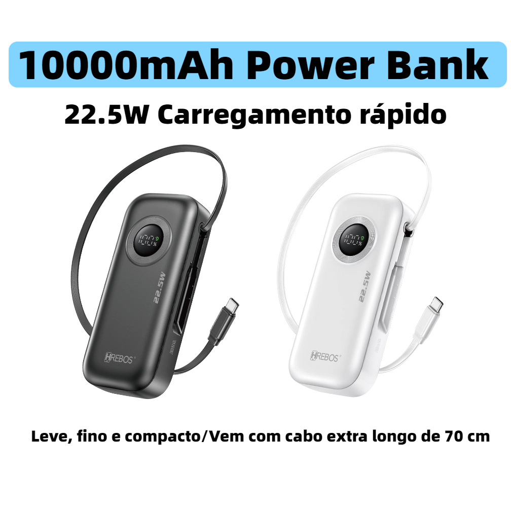 Carregador Portatil Power Bank 10000mah carregamento rápido de 22,5 W com cabo de dados de 70 cm HREBOS PB-199
