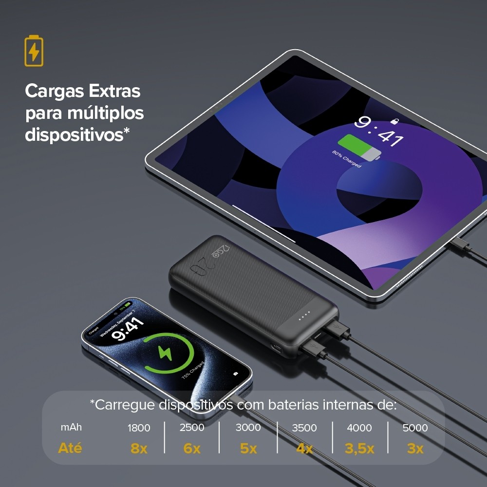 Mantenha seus dispositivos carregados onde quer que esteja com o Power Bank 20000 mAh. Esse carregador portátil oferece até 8 cargas extras para seu smartphone, garantindo que você nunca fique sem bateria, mesmo nos dias mais agitados. Ideal para longas viagens, dias de trabalho intensos ou aventuras ao ar livre, este power bank é o seu companheiro de energia confiável. Equipado com a tecnologia Smart Charge, o Power Bank 20.000 mAh possui duas saídas USB-A e uma saída USB-C inteligentes que distribuem a carga de forma eficiente, garantindo que seus dispositivos sejam carregados na velocidade máxima. Além disso, com a capacidade de carregar até três dispositivos ao mesmo tempo, incluindo smartphones, tablets e até mesmo alguns notebooks, você pode manter todos os seus gadgets prontos para uso sem comprometer a velocidade de carregamento. A praticidade não para por aí. Este power bank oferece carregamento rápido de até 12 W para dispositivos compatíveis com Power Delivery, seja através de cabos USB-C ou Lightning. E para que você sempre saiba quanta energia resta, ele conta com luzes de LED que indicam exatamente o nível de carga disponível, proporcionando total controle sobre seu uso. Construído para durar, o Power Bank 20.000 mAh é feito com uma bateria premium Tipo A, conhecida por sua resistência e segurança, o que permite que ele seja levado até em viagens de avião sem preocupações. Compacto, poderoso e seguro, este power bank é essencial para quem precisa de energia confiável em qualquer situação. Eleve a sua experiência de mobilidade com o Power Bank 20.000 mAh. Não espere até ficar sem bateria. Adquira o seu agora e esteja sempre preparado para manter seus dispositivos funcionando, onde quer que esteja. Capacidade de 20.000mAh: Fornece até 8 cargas extras para smartphones, garantindo que seus dispositivos estejam sempre prontos, mesmo nos dias mais intensos. Tecnologia Smart Charge: As duas saídas USB inteligentes ajustam automaticamente a potência necessária para carregar seus dispositivos na velocidade máxima, otimizando o tempo de carregamento. Carregamento versátil: Com três portas (2 USB e 1 USB-C), você pode carregar até três dispositivos simultaneamente, como smartphones, tablets e até notebooks, sem comprometer a eficiência. Carregamento Rápido de 12 W: Equipado para fornecer carregamento rápido de até 12W, ideal para dispositivos compatíveis com Power Delivery, utilizando cabos USB-C ou Lightning. Indicadores de LED: Luzes de LED exibem a quantidade exata de carga restante, permitindo que você monitore facilmente o nível de energia disponível. Bateria Premium Tipo A: Construído com uma bateria de alta qualidade, resistente e segura, ideal para viagens, inclusive em aviões, sem risco de superaquecimento ou explosão. Design Compacto e Seguro: Leve e fácil de transportar, o power bank é perfeito para o dia a dia, oferecendo uma solução de carregamento confiável e segura onde quer que você vá. *Carregue dispositivos com baterias internas de: 1800 mAh - Até 8x 2500 mAh - Até 6x 3000 mAh - Até 4x 4000 mAh - Até 3,5x 5000 mAh - Até 3x Especificações Técnicas: Capacidade: 20.000 mAh Entrada Micro-USB: 5 V 2 A Entrada / Saída USB-C: 5 V 2,4 A (12 W MAX) 2 Saídas USB-A: 5 V 2,4 A (12 W MAX) Dimensões: 149 x 69 x 28 mm *Garantia i2GO: Esse produto está garantido contra defeitos de fabricação por 1 ano. Para ativar 2 anos mais (3 anos no total), registre seu produto em nosso site.