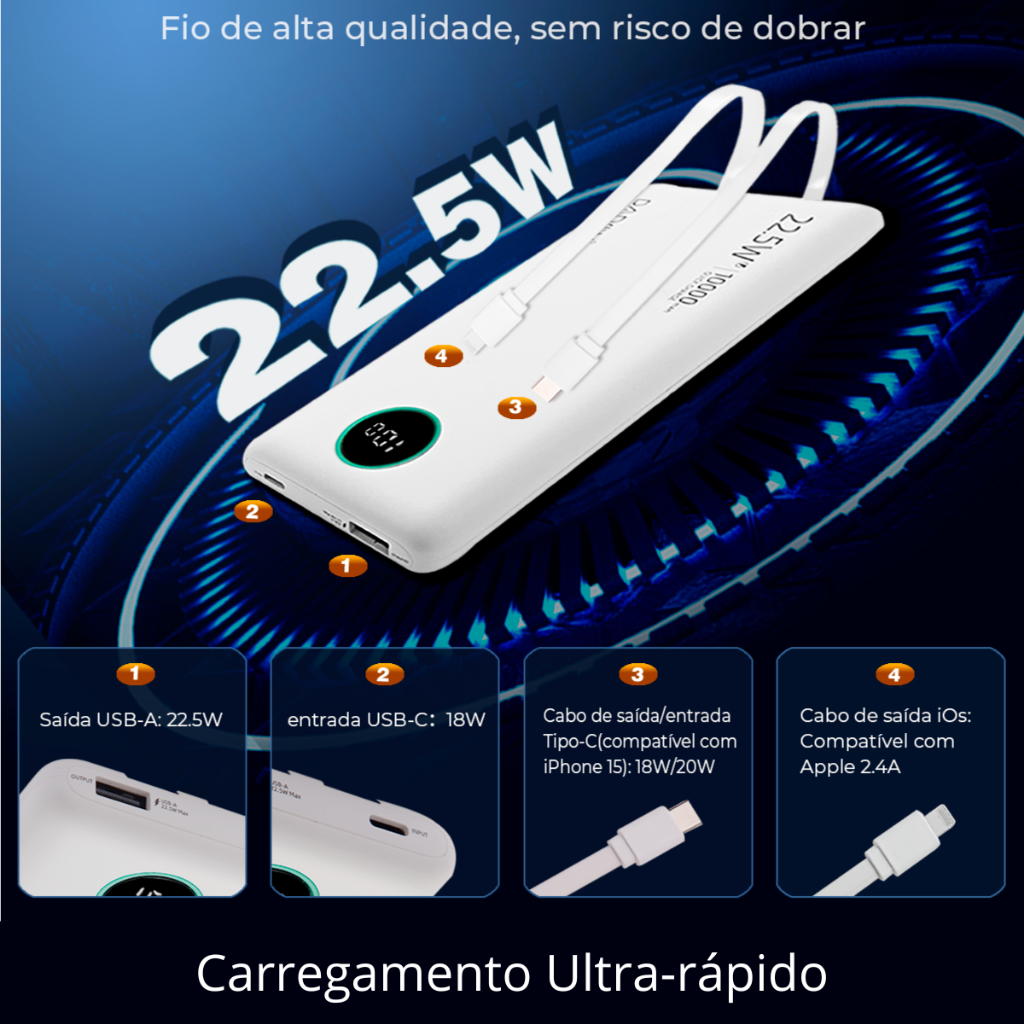 Carregador Powerbank Dapon J153 Quick Charge 22.5w 10.000mah O Carregador Powerbank Dapon J153 é a solução perfeita para quem precisa de energia móvel e rápida! Com uma capacidade de 10.000mAh, ele garante que seus dispositivos permaneçam carregados durante todo o dia, ideal para o uso diário. Principais Características: Alta Capacidade: Com 10.000mAh, você terá energia suficiente para recarregar seu smartphone várias vezes. Carregamento Rápido: Suporta Quick Charge de 22.5W, permitindo que seus dispositivos sejam carregados rapidamente, sem perder tempo. Design Portátil: Leve e fino, perfeito para levar em viagens, camping ou caminhadas. Ele se encaixa facilmente em sua mochila ou bolsa. Visor Inteligente: Com um visor de LED, você poderá visualizar facilmente o nível de carga do seu powerbank. Conectividade: Entradas e Saídas Versáteis: Possui entrada USB-C e USB-A, além de saídas USB-C, Lightning e cabo USB, garantindo ampla compatibilidade com diversos dispositivos. Interruptor Liga/Desliga: Permite que você ative ou desative o powerbank conforme necessário, economizando bateria. Especificações Técnicas: Marca: Dapon Capacidade Nominal: 5800mAh Peso: 247g Saída Total: 5V-3A