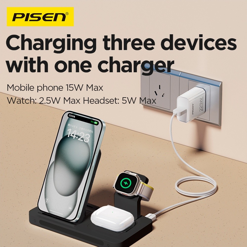 Carregador Sem Fio Qi Pisen 3 em 1 MagSafe pra Ios Preto