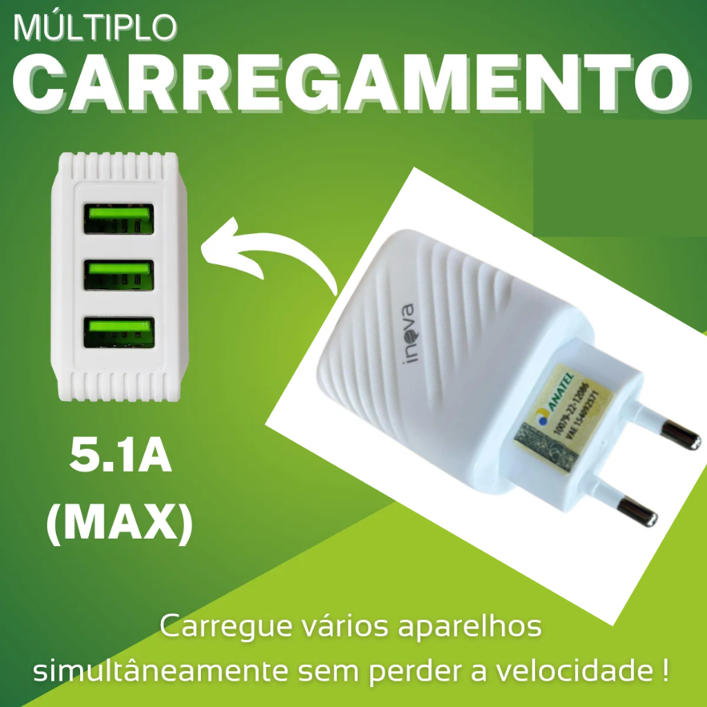 Carregador Triplo Rápido 5.1 Amperes 25.5 Watts 3 USB Saídas
