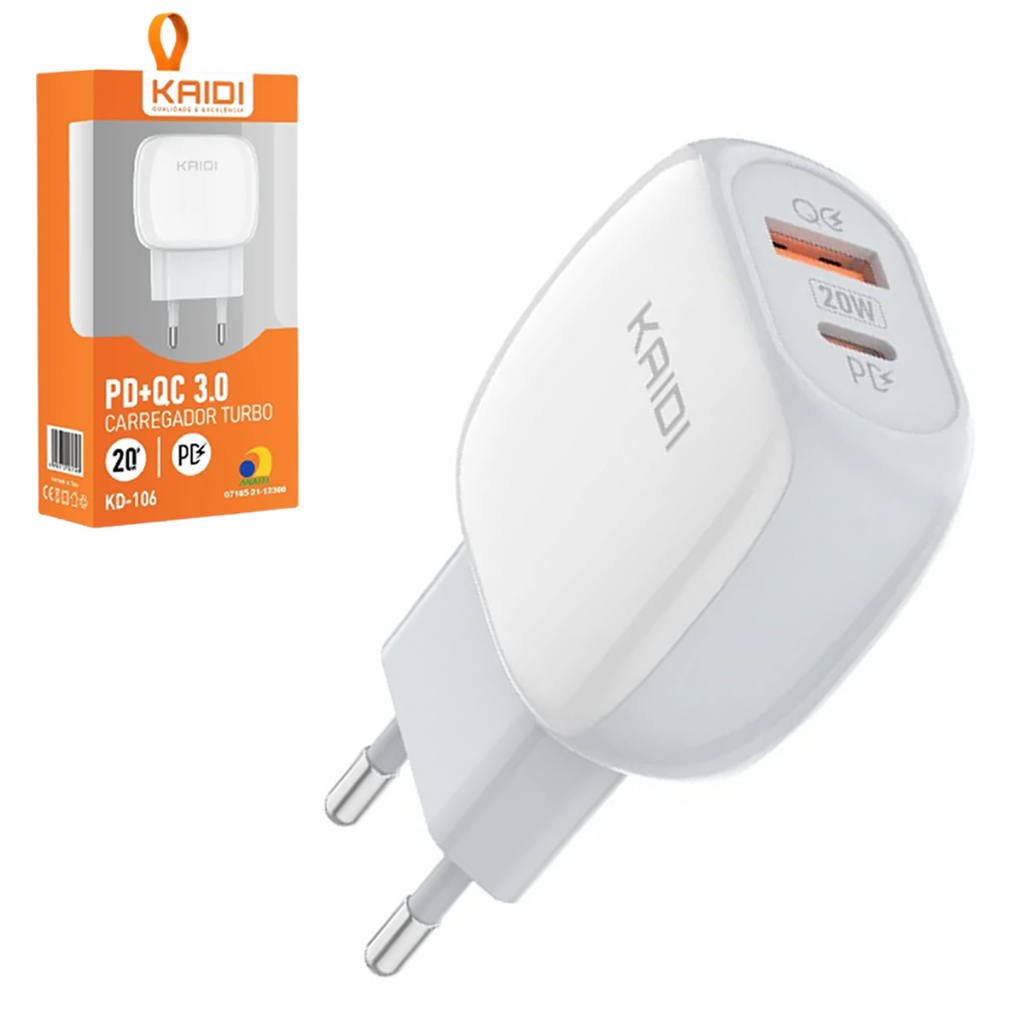 Carregador Turbo 20W USB C Duplo PD Kaidi Kd-106 duas saídas