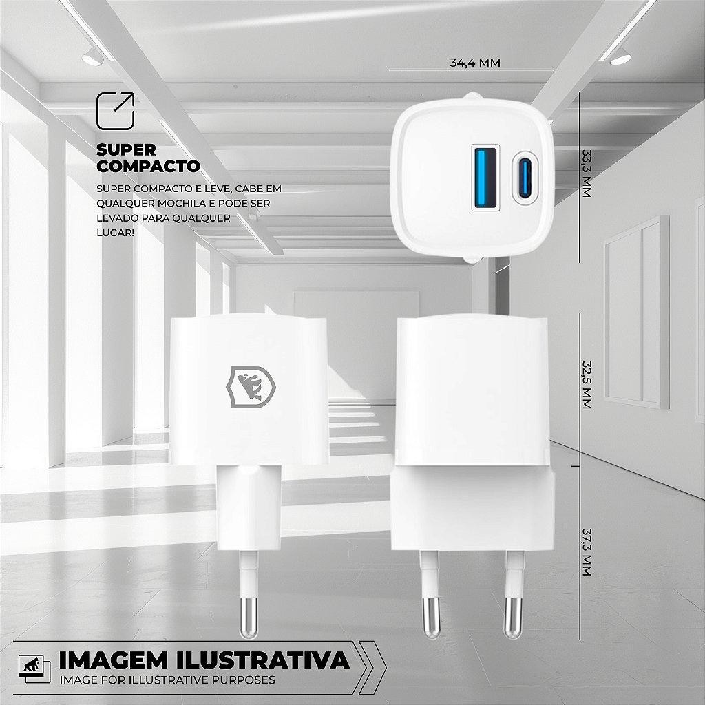 Experimente o equilíbrio perfeito entre design e funcionalidade com o Carregador Ultra Slim 20W da Gshield. Compacto e elegante, com um acabamento branco sofisticado, ele é o acessório ideal para quem valoriza praticidade e estilo no dia a dia, sem abrir mão de uma performance de carregamento rápida e eficiente O carregador conta com a avançada tecnologia GaN (Nitreto de Gálio), que permite uma eficiência energética superior e design compacto. Comparado aos carregadores convencionais, ele aquece menos e oferece uma velocidade de carregamento mais rápida, garantindo maior durabilidade e desempenho otimizado. Com o GaN, você tem potência e praticidade em um único dispositivo, ideal para quem busca eficiência no dia a dia. Desempenho Versátil e Carregamento Rápido O carregador conta com uma porta Tipo-C com suporte a Power Delivery, proporcionando carregamento acelerado para uma ampla variedade de dispositivos, e uma porta USB-A para carregamento padrão, oferecendo flexibilidade para conectar diversos aparelhos ao mesmo tempo. Com potência de 20W, ele é ideal para carregar rapidamente smartphones, tablets e outros gadgets, mantendo você conectado onde quer que esteja, seja em casa, no escritório ou em trânsito. Tecnologia HeatControl e Segurança Reforçada A segurança é prioridade com a tecnologia HeatControl, que mantém seus dispositivos protegidos contra superaquecimento, assegurando um carregamento seguro e contínuo. Aliada à proteção contra sobretensão, esta tecnologia evita picos de energia que podem danificar tanto o carregador quanto os dispositivos conectados, garantindo maior durabilidade e tranquilidade para o usuário. Estilo Compacto e Alta Portabilidade O design ultrafino e leve permite que você leve o carregador facilmente no bolso, em bolsas ou mochilas, sendo um item essencial para quem está sempre em movimento. Pequeno, mas poderoso, ele é mais do que um simples carregador: é uma solução completa que alia estética e funcionalidade. Benefícios em Destaque Carregamento Rápido e Eficiente: Com saída de 20W, recarrega seus dispositivos em menos tempo. Proteção Avançada: HeatControl e proteção contra sobretensão para um carregamento seguro. Flexibilidade de Conexão: Porta Tipo-C com Power Delivery e porta USB-A para múltiplos dispositivos. Portabilidade e Elegância: Design compacto com acabamento branco sofisticado, perfeito para o dia a dia. Transforme sua experiência de carregamento com o Carregador Ultra Slim 20W da Gshield, onde a estética encontra a tecnologia. Ideal para quem busca um carregador confiável, seguro e elegante para acompanhar seu estilo de vida dinâmico. ESPECIFICAÇÕES Marca: Gshield Potência Máxima de Saída: 20W Cor: Branco Portas: Tipo-C: Power Delivery | USB-A: Carregamento padrão Entrada: 100-240V~50/60Hz 0.5A Saída: Tipo-C: 5V=3A, 9V=2.22A, 12V=1.67A | USB-A: 5V=3A