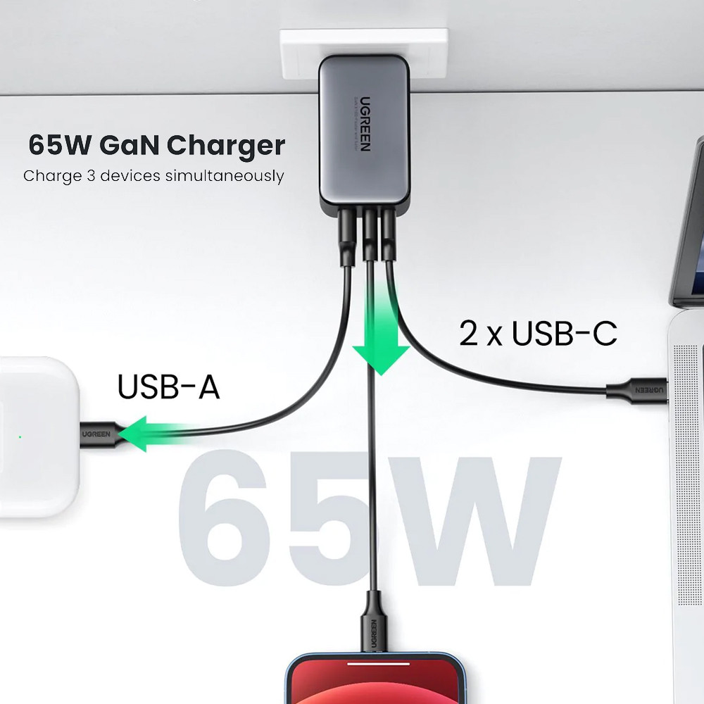 Carregador Ugreen 3 em 1 Gan X 65W Porta Usb C e Usb A
