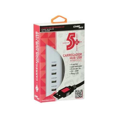 CARREGADOR VEICULAR 12V COM 4 SAÍDAS USB Produto com 4 portas USB, idealizado para carregar celulares, tablets, câmeras, MP3 e aparelhos compatíveis com USB 5V. Para Iphones e demais celulares, a porta mais indicada é a de 1A. ESPECIFICAÇÕES TÉCNICAS - Alimentação: Bivolt - Modelo: 044-2006 - Marca: CHIPSCE - Portas USB: 4 (0.5A, 1A e 2A) - Proteção contra sobrecarga CARREGADOR VEICULAR 12V COM 4 SAÍDAS USB Produto com 4 portas USB, idealizado para carregar celulares, tablets, câmeras, MP3 e aparelhos compatíveis com USB 5V. Para Iphones e demais celulares, a porta mais indicada é a de 1A. ESPECIFICAÇÕES TÉCNICAS - Alimentação: Bivolt - Modelo: 044-2006 - Marca: CHIPSCE - Portas USB: 4 (0.5A, 1A e 2A) - Proteção contra sobrecarga