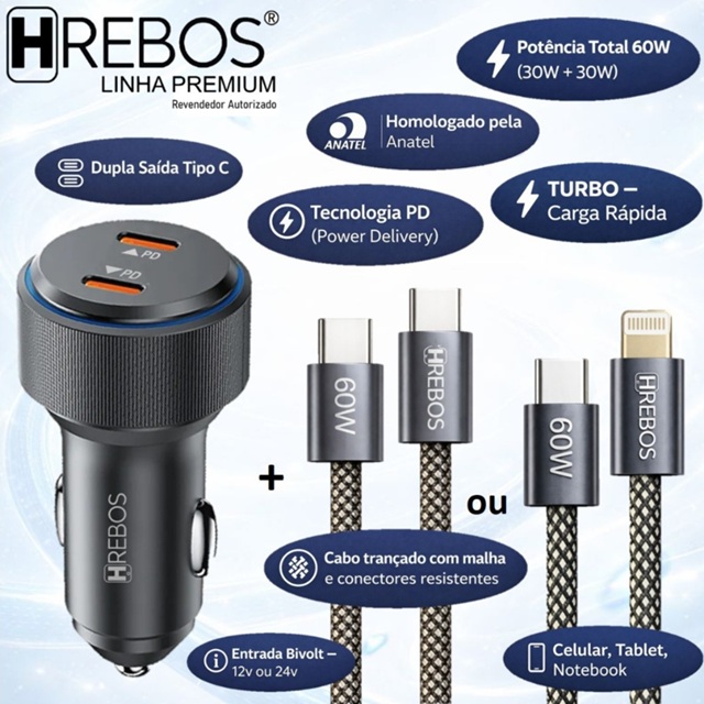 | Carregador Veicular Hrebos 60W USB-C PD Dupla Saída | Kit com Cabo ... este produto | R$ 39,82 | 29% | 4.9/5 | 72 |