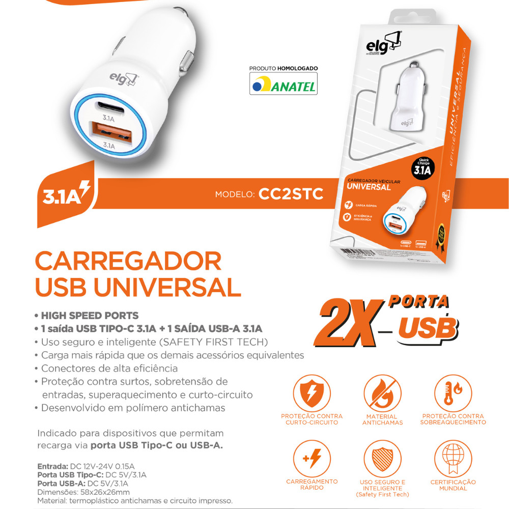 Velocidade, segurança e durabilidade: sua recarga com potência máxima. O Carregador Veicular Universal ELG CC2STC foi projetado para oferecer praticidade e eficiência em qualquer situação. Compacto e moderno, ele conta com duas saídas de 3.1A – uma USB Tipo-C e outra USB-A –, permitindo carregar simultaneamente smartphones, GPS e outros dispositivos eletrônicos de forma rápida e estável. Graças ao seu chip inteligente, o CC2STC identifica automaticamente a necessidade de energia do dispositivo conectado, fornecendo a corrente ideal para um carregamento seguro e eficiente. Além disso, conta com sistemas internos de proteção contra sobrecorrente, sobretensão, sobrecarga, aquecimento e curto-circuito, garantindo mais segurança para seus aparelhos e maior durabilidade para o produto. Compatível com entradas DC 12–24V, é ideal para viagens, passeios ou uso diário, mantendo seus dispositivos sempre prontos para uso. Na embalagem, você recebe 1 carregador veicular ELG CC2STC, pronto para uso imediato. Características Técnicas Materiais: Termoplástico antichamas e circuito impresso Compatibilidade: Dispositivos que permitam recarga via porta USB Voltagem de Entrada: DC 12–24V Saída: 5V – 3.1A (máximo) Proteções: Contra sobrecorrente, sobretensão, sobrecarga, aquecimento e curto-circuito Extras: Chip inteligente, design compacto, carga rápida 3.1A Cor: Branco IMPORTANTE :: As imagens dos produtos são meramente ilustrativas e podem apresentar pequenas variações de cor ou acabamento, conforme iluminação, resolução do monitor ou percepção visual. :: Objetos de decoração e itens adicionais exibidos nas fotos não acompanham o produto. :: Todas as informações técnicas e características dos produtos são de responsabilidade da marca ELG, podendo sofrer alterações sem aviso prévio. :: Os pedidos são sempre enviados de forma completa. Caso haja produtos com prazos de postagem diferentes, será considerado o maior prazo para envio do pedido. :: Valores e condições podem ser alterados sem aviso prévio e são válidos exclusivamente para compras realizadas neste site. :: A garantia ELG é limitada ao produto e não cobre danos ocasionados por mau uso, instalação incorreta ou manuseio inadequado. SOBRE A ELG: A ELG é uma empresa brasileira que preza pela alta qualidade. Nossa política é aplicada em toda linha de produtos e garante que os consumidores possam adquirir itens que foram amplamente testados.