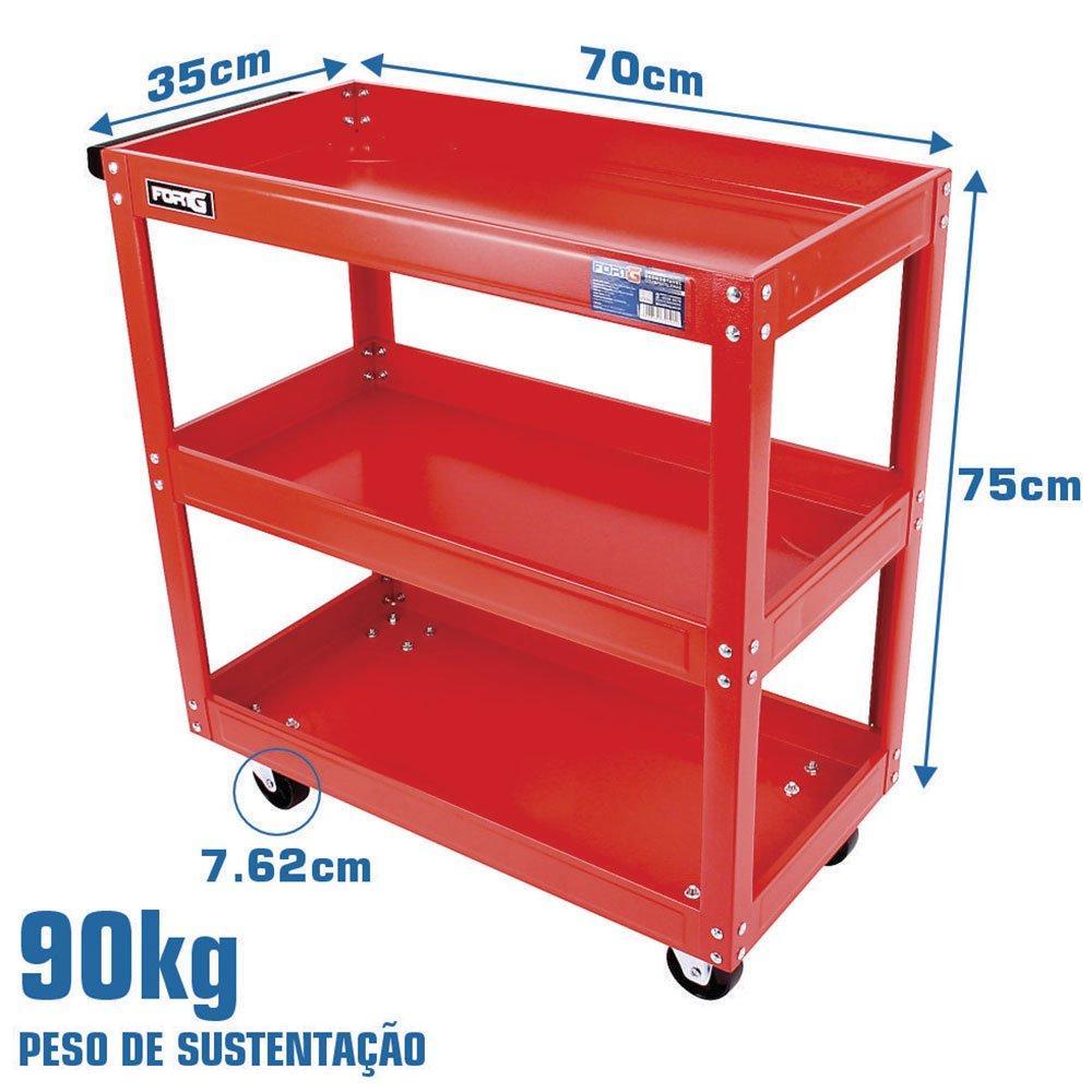 Loja do Mecânico - O que você precisa, nós temos! É perfeito para sua oficina como estação de trabalho ou transporte de ferramentas. Resistente e durável, feito com 3 prateleiras em chapa de aço com tratamento de antioxidante e pintura eletrostática a pó epóxi. - Especificações Técnicas: :: Dimensão Total: 700x350x750mm, com rodízio :: Bandejas: 700x350x60mm :: Peso de sustentação: 90kg (30kg por bandeja) :: Rodízios: - Material: PP - Tamanho: 76,2mm :: Peso total: 8.3kg - Conteúdo da Embalagem: :: 1 Carrinho com 3 Prateleiras - Garantia: 6 Meses - 7908591701012 Ref.: FORTGPRO-FG6000S Marca.: FORTGPRO