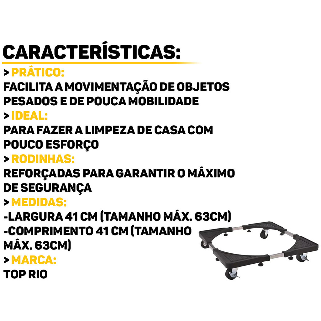 Carrinho Multiuso Top Rio O Carrinho Multiuso é a solução prática e versátil para transporte, movimentação e o apoio de eletrodomésticos pesados. Fabricado com materiais de alta qualidade e resistência, garante segurança e estabilidade ao mover itens como geladeiras, máquinas de lavar, e outros. Com design compacto e funcional, ele possui rodas giratórias que facilitam a locomoção. Este carrinho garante praticidade e segurança para transportar seus eletrodomésticos com facilidade, otimizando o espaço e a organização da sua casa. Características: > Estrutura reforçada; > Possui rodas com travas; > Possui ajuste de tamanho; > Resistente à pressão e corrosão; > Fácil de ser movimentado e fácil limpeza; > Mantém a ventilação dos móveis e eletrodomésticos, evitando a umidade; > Adequado para colocar objetos pesados, como máquina de lavar, geladeira, entre outros. Especificações Técnicas: > Material: plástico e metal; > Capacidade máxima: 138kg; > Dimensões do produto (C x L x A): 41cm x 41cm x 68cm. - Marca: Top Rio - Garantia: 90 dias contra defeitos de fabricação Vantagens de comprar na Brester: - Produto a pronta entrega. - Produto novo, com garantia de fábrica. - Nota fiscal para Pessoa Física e Pessoa Jurídica.