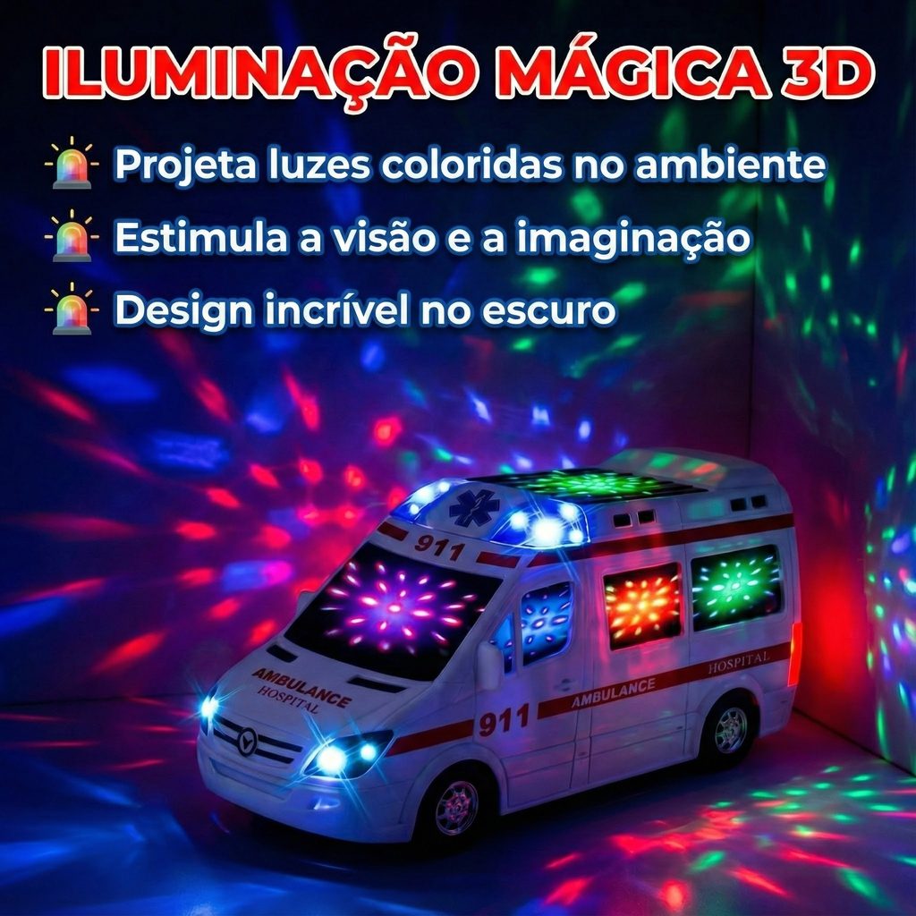 Carrinho Ambulância Van Samu Som Luz Sirene Bate e Volta Brinquedo Infantil Diversão Para Crianças Kizumba O carrinho ambulância infantil com som, luz e sirene transforma brincadeiras em verdadeiras missões de resgate, despertando a imaginação e o sentido de cuidado desde os primeiros anos. Com design pensado para crianças, este brinquedo simula uma ambulância real: ao ser acionado, emite luzes piscantes e sirene, o que estimula o reconhecimento de sons e a coordenação sensorial. Feito em plástico PVC resistente e durável, o brinquedo oferece leveza e segurança para as mãos dos pequenos, além de ser compacto e fácil de manusear. Ideal para rolamentos no chão, empurrar manualmente ou brincar de “salvar” bonecos, encoraja o desenvolvimento motor, criatividade e brincadeiras de faz-de-conta. Adequado para presentear crianças pequenas, ele combina diversão, estímulo educativo e segurança, sendo uma ótima opção para uso doméstico ou em espaços de recreação. Especificações Técnicas: • Material: Plástico • Funcionalidades: Luzes piscantes e emissão de som/sirene ao ser acionado • Tipo de acionamento: Manual Dimensões: • Altura: 9 cm • Comprimento: 17 cm • Largura: 8 cm FAQ - Perguntas Frequentes: 1. O brinquedo emite luz e som automaticamente? R: Sim — ao ser acionado, o carrinho emite sirene e luzes piscantes, simulando uma ambulância real. 2. Precisa de baterias ou pilhas para funcionar? R: Sim precisa de pilhas, que não são inclusas. 3. É seguro para crianças pequenas? R: Sim — o carrinho é feito com plástico resistente e seguro, com tamanho e formato adequados para o público infantil. 4. Serve para brincar dentro de casa e fora? R: Sim — por ser compacto e leve, pode ser usado em superfícies planas dentro de casa ou em espaços externos, desde que em terreno liso. Conteúdo da Embalagem: • 01 Carrinho Ambulância Importante: Valor Unitário Imagens Meramente Ilustrativas Não nos responsabilizamos pelo mau uso do produto