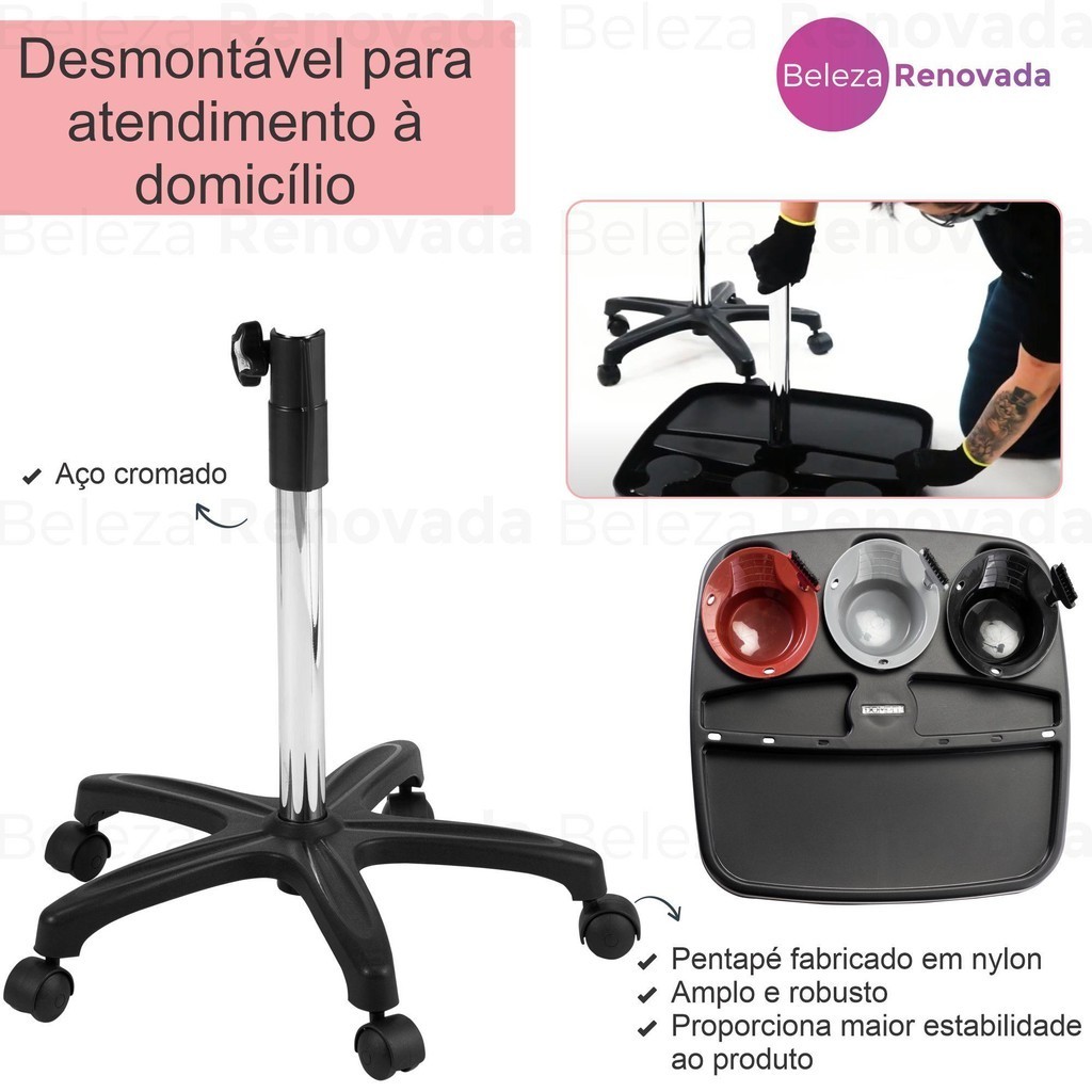 Carrinho Auxiliar Coloração Dompel Com 3 Tigelas 3 PincéisO Carrinho Auxiliar Coloração Dompel é a escolha perfeita para profissionais de beleza que buscam praticidade e eficiência. Com um design colorido, leve e portátil, este carrinho é composto por um kit completo de três tigelas e três pincéis, permitindo trabalhar com diversas tonalidades de cores simultaneamente. Atributos do Produto:Marca: Dompel Modelo: Multicolor Tintura Mesa Coloração Multiu Altura: 91 cm Kit: Não Tipo: Carrinho Auxiliar multiuso Quantidade: 1 Com Rodas: Sim Material: Polímeros de alta resistência Características do Produto:O Carrinho Auxiliar Coloração Dompel destaca-se pelas seguintes características: Tampo Amplo e Bem Dividido:O tampo do carrinho acompanha três tigelas com três pincéis, proporcionando um espaço amplo e organizado. Com compartimento para acessórios e tigelas, facilita o trabalho do profissional durante a coloração, mantendo tudo ao alcance das mãos. Estrutura Resistente e Versátil:A estrutura do carrinho é fabricada com polímero injetado e haste de aço, garantindo durabilidade e resistência. Além disso, possui regulagem de altura, possibilitando que o profissional trabalhe tanto em pé quanto sentado, adaptando-se às necessidades de cada situação. Base Estável e Móvel:A base pentapé do carrinho conta com rodízios fabricados em nylon, conferindo estabilidade e mobilidade ao produto. Com essa base sólida, o carrinho se mantém firme durante o uso, garantindo segurança e conforto ao profissional. Escolha a sua cor:Disponível em diversas opções de cores para combinar com o seu ambiente de trabalho: 470 – Preto