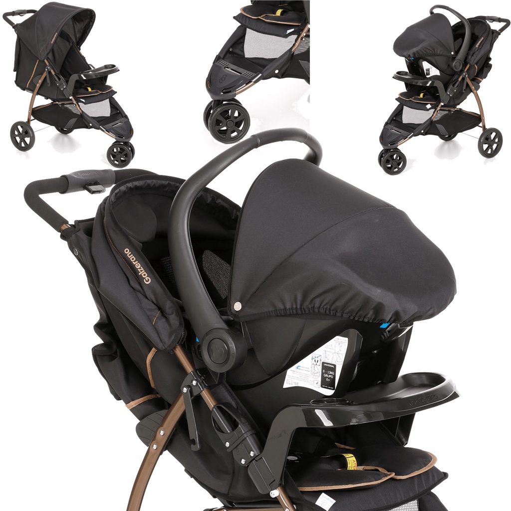 Carrinho com Bebe Conforto Base Galzerano Cross Preto Cobre