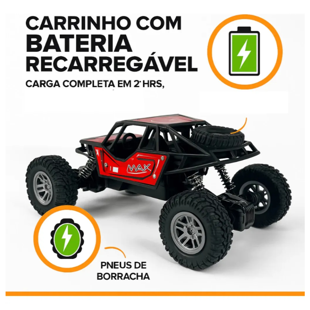 Carrinho Off Road de Controle Remoto desenvolvido para proporcionar aventura, desempenho e diversão para crianças a partir de 3 anos. Com design inspirado em veículos off-road, possui estrutura reforçada, acabamento esportivo e visual robusto, ideal para brincadeiras em terrenos variados como terra, areia e pisos irregulares. O modelo conta com sistema de suspensão com molas soft, que absorvem impactos e garantem melhor estabilidade durante a condução. Os pneus de borracha oferecem maior aderência ao solo, proporcionando tração eficiente e movimentos suaves. O controle remoto permite aceleração e direção precisas, tornando a experiência de uso mais intuitiva e divertida. Equipado com bateria recarregável, o carrinho oferece autonomia média de aproximadamente 25 a 30 minutos de uso contínuo, com tempo de recarga em torno de 2 horas. O alcance do controle remoto chega a até 30 metros, permitindo liberdade de movimento durante a brincadeira. O carregamento é feito de forma prática através de cabo USB. Fabricado em plástico resistente e de alta qualidade, é um brinquedo durável e seguro para o público infantil, desde que utilizado sob supervisão de um adulto. O produto acompanha carrinho, controle remoto, bateria recarregável e cabo USB para carregamento. O controle remoto funciona com pilhas, conforme especificação do fabricante. Ideal para estimular coordenação motora, noção espacial e imaginação, o Carrinho Off Road de Controle Remoto é uma excelente opção de presente para crianças que gostam de velocidade, aventura e desafios.