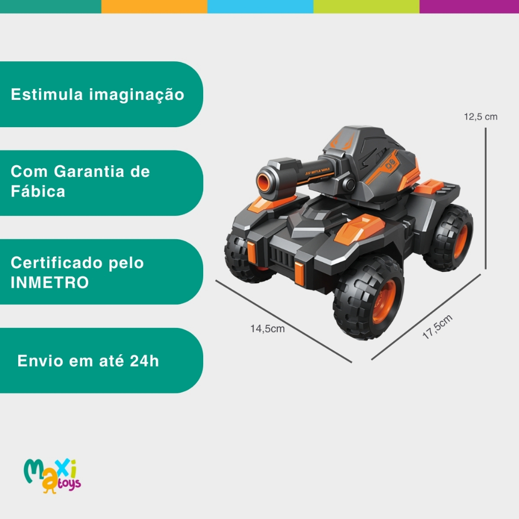 Carrinho de Controle Remoto Tanque com Lançador de Bolas Hidrogel Orbeez Water Bomb Laranja Maxi Toys O Water Bomb Car com Controle Remoto Maxi Toys é muito mais do que um simples brinquedo: é a evolução dos carrinhos de controle remoto. Desenvolvido para entregar ação, interatividade e inovação, este incrível tanque lançador de bola em gel Orbeez transforma qualquer espaço em um verdadeiro campo de batalha divertido. A característica mais marcante deste tanque é sua capacidade de disparar bolas de hidrogel orbeez . Essas bolas são pequenas esferas que, quando disparadas, explodem suavemente com o impacto, adicionando um toque de realismo e emoção às batalhas. Elas são seguras para crianças e não causam danos, pois são macias e se dissolvem rapidamente. Luz de LED e Sons dinâmicos e frequência de 49 MHz, o carrinho possui os comandos por controle remoto de ir para frente, para trás, curvar à esquerda ou à direita, garantindo manobras ágeis e cheias de emoção. Seu diferencial está no tanque com rotação de até 180 graus, capaz de lançar bolas em diversas direções deixando as brincadeiras ainda mais realistas e empolgantes. Um verdadeiro espetáculo para quem procura um carro de controle remoto infantil que foge do comum. A diversão não para por aí: Equipado com bateria de lítio recarregável de 500 mA e 3,7 V, já integrada no carro, ele acompanha cabo USB, proporcionando praticidade e autonomia. O controle remoto funciona com 2 pilhas AA, completando a experiência de forma simples e eficiente. Com dimensões compactas de 17,5 x 14,5 x 12,5 cm, o carrinho tanque de controle remoto é fácil de transportar e manobrar, mas suficientemente robusto para encarar qualquer terreno durante as aventuras. Seja para presentear ou colecionar, o Water Bomb Car com Controle Remoto Maxi Toys é a opção perfeita para quem busca carrinhos de controle remoto diferentes, repletos de recursos inovadores, que unem ação, criatividade e momentos inesquecíveis de diversão. Principais Características: - Idade Recomendada: A Partir de 3 Anos - Lança bolas de Hidrogel Orbeez - Funções: Frente, trás, curva esquerda, curva direita - Tanque com rotação de 180º graus - Bateria recarregável de lítio 500 mA / 3,7 V (interna no carro) - Luzes LED e música dinâmica - Carregador USB incluso - Atinge velocidades de até 6 km/h. - Design robusto e moderno - Diversão garantida em diferentes tipos de pisos - Controle remoto utiliza 2 pilhas AA (não inclusas) - Controle remoto com alcance de 10 a 15 metros em áreas abertas e 5 a 10 metros em ambientes internos ou com interferência (paredes, móveis, outros eletrônicos). - Estimula coordenação motora, imaginação e interação entre amigos ou pais e filhos - Produto Certificado pelo INMETRO - Disponível nas cores: Verde e Laranja Especificações Técnicas: - Conteúdo da Embalagem: 01 Tanque, 01 Controle Remoto, 01 Saquinho de Orbeez, 01 Cabo USB e Manual de Instruções. - Dimensões do Produto 17,5 x 14,5 x 12,5 cm aprox. - Peso Líquido: 878g aprox. - Composição/Material: Plástico ABS não tóxico, garantindo segurança para crianças. - Alimentação Carrinho: Utiliza bateria de lítio reutilizável de 3,7 V (incluída). - Garantia: 90 dias (Contra Defeitos de Fabricação Pelo Fabricante) - Certificação INMETRO 009735/2024 - ANATEL 06611-24-14795 - Código do Fabricante: 21913/ 21914 - EAN: 7899403219132/ 7899403219149 - Marca: Maxi Toys Imagens Meramente Ilustrativas. As cores e estampas podem variar de acordo com o lote do fabricante.