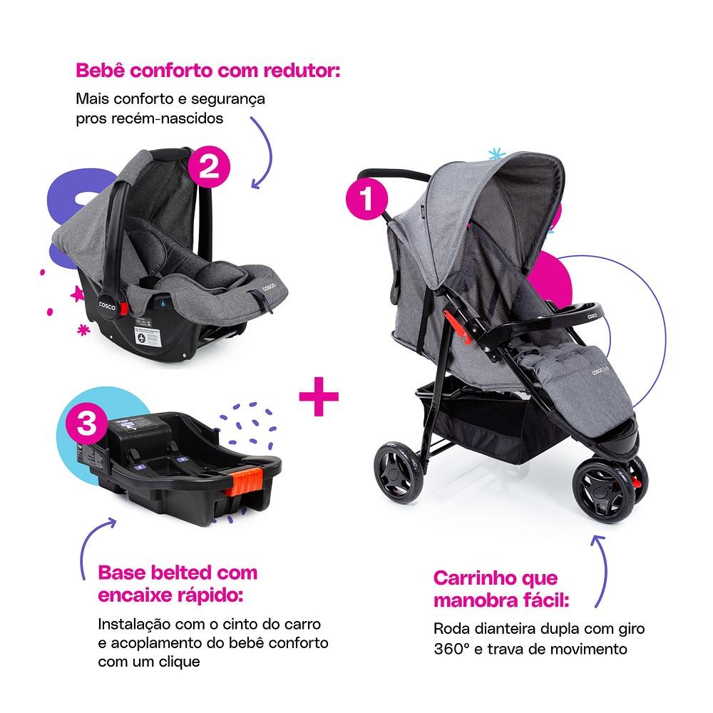 Carrinho de Bebê Com Bebê Conforto e Base Travel System Trio Toffy Cosco Kids Cinza
