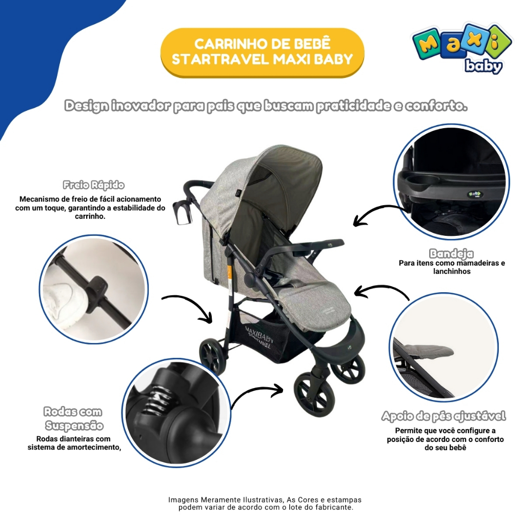 Carrinho de Bebê Com Bebê Conforto Startravel - Maxi Baby O Carrinho de Passeio StarTravel e o Bebê Conforto StarTravel são a combinação perfeita para pais que buscam praticidade, segurança e conforto para seus pequenos. O Carrinho possui uma estrutura em aço, assento de poliéster e PU que oferece robustez e resistência. Seu sistema de retenção é composto por PP e poliéster, garantindo a proteção da criança. Com mecanismo de travamento por liberação em duas ações consecutivas, o carrinho é fácil de manusear e não necessita de ferramentas para montagem. Inclui acessórios como cesta porta-objetos, bandeja frontal e porta bebidas, tornando-o ainda mais funcional. Adequado para crianças a partir de 0 meses até 3 anos (15 kg), é a solução perfeita para passeios tranquilos e seguros. O Bebê Conforto Startravel, fabricado com materiais de PP e poliéster, oferece total segurança para o transporte do seu pequeno. Com sistema de retenção integral de 5 pontos e capacidade para o grupo 0+, acompanha capota e almofada redutora para maior conforto. Seu sistema de fixação no veículo é feito através do cinto de segurança de 3 pontos, proporcionando estabilidade e segurança durante o trajeto. Ideal para complementar o Carrinho de Passeio, o Bebê Conforto Startravel garante viagens mais seguras e confortáveis para você e seu bebê. Principais Características do Carrinho: - Idade recomendada: De 0 Meses à 3 Anos (15 kg) - Sistema de fechamento simples que pode ser realizado com uma única mão. - Trava adicional para maior segurança durante o transporte. - Rodas dianteiras destacáveis (17x5 cm) e rodas traseiras (20x5 cm), com suspensão e rolamento para condução suave. - Mecanismo de travamento fácil e freio de um toque. - Cinto de segurança de 5 pontos e descanso de pernas ajustável. - Capota destacável para proteção solar e maior visibilidade. - Cesto porta-objetos removível para armazenamento fácil. - Mini bolso traseiro para facilitar o acesso a itens essenciais. - Conjunto de rodas dianteiras giratórias para fácil manobra. - Gancho dobrável automático para facilitar o armazenamento. - Suporte para copos para maior praticidade. Principais Características do Bebê Conforto: - Idade Recomendada: De 0 meses até 13 kgs. - Mecanismo de Travamento: Liberação em duas ações consecutivas, sem a necessidade de ferramentas. - Sistema de Retenção: Cinto de 5 pontos (integral). - Fixação no Veículo: Cinto de segurança de 3 pontos do veículo. - Acessórios Inclusos: Capota e Almofada redutora para conforto extra. - Tipo: Bebê conforto, adequado para transporte no carro. - Escolha entre as cores: Preto ou Cinza Especificações Técnicas: - Conteúdo Da Embalagem: 1 Carrinho, 1 Bebê Conforto e 1 Manual De Instrução - Composição/Material: Estrutura em Aço, sistema de retenção em polipropileno e PU e assento em Poliéster e PU - Dimensões: Carrinho: 94,0 x 52,0 x 105 cm. Bebê Conforto: 51,0 x 60,0 x 42,0 CM cm aprox. - Peso: Carrinho: 8,5 kgs aprox. Bebê conforto: 3 kgs aprox. - Garantia: 12 Meses (Contra defeitos de fabricação pelo fabricante) - Certificação: INMETRO 014730/2024 - Código Do Fabricante: 21790 / 21791 - EAN: 7899403217909 / 7899403217916 - Marca: Maxi Baby Imagens Meramente Ilustrativas, As Cores E Estampas Podem Variar De Acordo Com O Lote Do Fabricante.