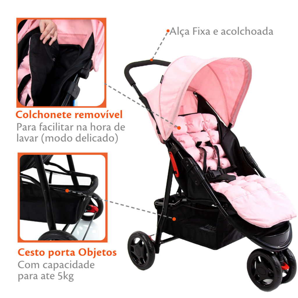 Carrinho Delta Voyage – Conforto e praticidade para o seu bebê! Carrinho de 3 rodas, ideal para crianças de 0 a 15 kg. Com colchonete removível e lavável, cinto de 5 pontos, encosto reclinável tipo berço e apoio de pés ajustável. Perfeito para passeios seguros e confortáveis. Características: -Colchonete acolchoado removível e lavável - Inclinação total do encosto, tipo berço - Manopla inteiriça acolchoada - Capota retrátil e com visor - Apoio ajustável de pés - Barra frontal removível - Cinto de segurança de 5 pontos com ajuste de altura - Bolso na capota - Amplo cesto de conveniência Modelos Compatíveis: - Bebê conforto Beta, Voyage (adaptadores e bebê conforto vendidos separadamente) Especificações: - Cor: Rosa Mescla - Fechamento: Envelope - Idade indicada: 0 a 15 kg - Material Estrutura: Ferro e polipropileno - Revestimento: Poliéster - Peso do Produto: 7kg - Dimensões: Aberto 98x54x84,7 | Fechado 84x45x16 - Garantia: 6 meses (Garantia Padrão) + 6 meses (Garantia Estendida*) - Conteúdo da embalagem: 1 carrinho e 1 manual *Registre seu produto no site da marca e ganhe garantia estendida de mais 6 meses. *Todos os produtos possuem Nota Fiscal Eletrônica *Aprovado pelo INMETRO conforme a norma ABNT NBR 14.389 para crianças do nascimento aos 15kg.