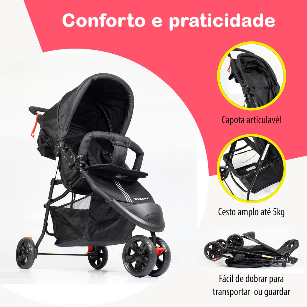Carrinho De Bebê EasyGo Com Cesto 3 Rodas Até 15kg KaBaby - Preto