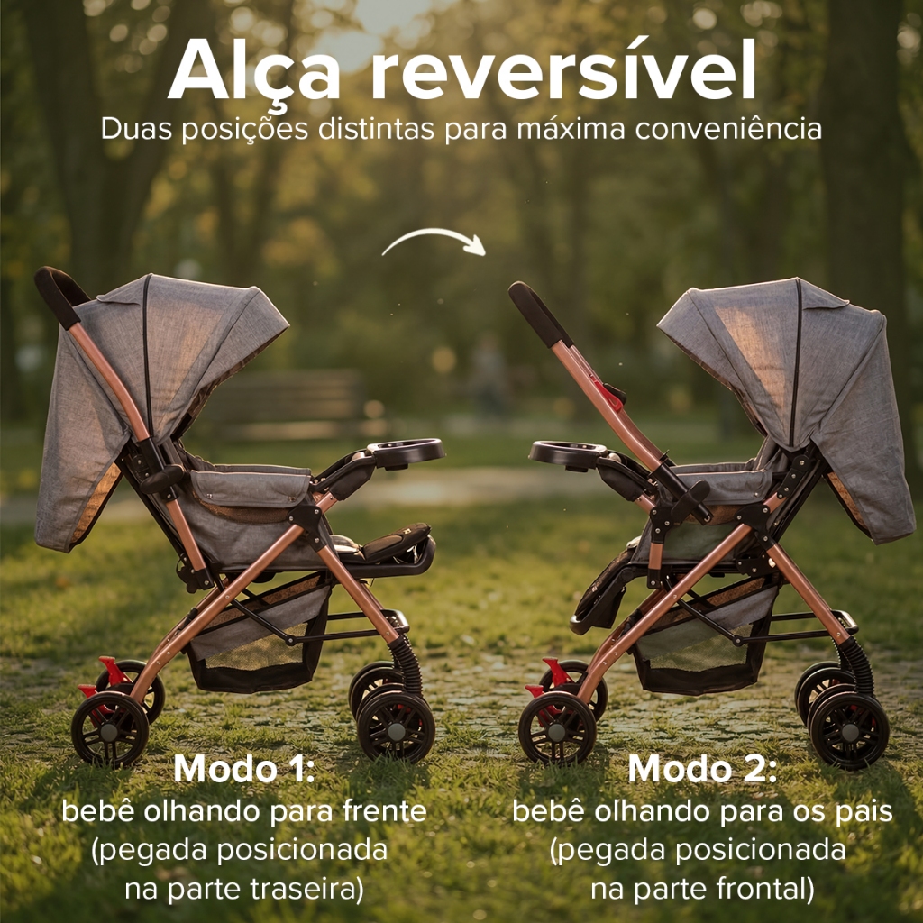 Apresentamos o Carrinho de Bebê Passeio Reclinável Reversível, a escolha ideal para pais que buscam conforto, segurança, versatilidade e praticidade no dia a dia. Desenvolvido para acompanhar o crescimento do bebê desde o nascimento até os 36 meses, ele permite que o bebê deite, sente e fique em diferentes posições, sempre com total conforto. Seu grande diferencial é o assento reversível, que possibilita passeios de duas formas: Modo convencional: bebê voltado para frente Modo reversível: bebê virado para quem está conduzindo o carrinho Ideal para recém-nascidos e para momentos em que o contato visual traz mais segurança e tranquilidade. Principais Benefícios - Assento reversível (bebê voltado para frente ou para quem conduz) - Uso desde recém-nascido até 36 meses - 3 posições de reclinação, incluindo posição totalmente deitada - Sistema de suspensão para passeios mais suaves - Freio traseiro para maior segurança - Capota retrátil com janela, permitindo ventilação e visualização do bebê - Ajuste de pedal em 90°, acompanhando o crescimento da criança - Funcional para diversos tipos de terreno - Estrutura de alumínio reforçado resistente e durável na cor Rose Gold Conforto e Funcionalidade - O carrinho conta com assento confortável e ergonômico, permitindo que o bebê fique sentado ou deitado em todos os ângulos, ideal tanto para passeios quanto para o descanso. - O assento reversível proporciona mais proximidade entre pais e bebê nos primeiros meses e mais autonomia conforme a criança cresce. - O forro removível facilita a higienização, garantindo praticidade no dia a dia. Acessórios Inclusos Apoio para pés Bolso lateral Porta garrafa Bandeja frontal Forro desmontável Dimensões do Produto Largura: 48 cm Altura: 100 cm Comprimento: 90 cm Especificações Técnicas Tipo: Carrinho de passeio reversível Peso máximo suportado : 15 kg Idade recomendada: 0 a 36 meses Reclinação: 3 posições Rodas: Rodas duplas Estrutura: Metal Capota: Retrátil com janela Freio: Sim Ajuste de pedal: 90° Peso do produto : 8 kg Dúvidas Frequentes : O carrinho é realmente reversível? Sim. O assento pode ser facilmente ajustado para o bebê ficar voltado para frente ou para quem conduz o carrinho. É indicado para recém-nascidos? Sim. Possui posição totalmente reclinável e modo reversível, ideal desde o nascimento. Serve para terrenos irregulares? Sim. As rodas duplas e o sistema de suspensão garantem conforto em diferentes tipos de terreno. MINHA COMPRA É SEGURA? Toda transação na Shopee é feita em ambiente seguro, isso significa que caso ocorra algum imprevisto a Shopee fará o estorno do seu pagamento. Garantia e Política de Devolução : Todos os nossos produtos possuem 3 meses de garantia contra defeitos de fabricação, garantindo mais segurança na sua compra. • 1 mês de garantia para troca completa do produto, caso seja identificado defeito de fabricação no item recebido. • 3 meses de garantia para peças, acessórios e suporte técnico, para eventuais substituições ou orientações de uso. Caso ocorra qualquer problema, nossa equipe está disponível para prestar suporte rápido e eficiente.