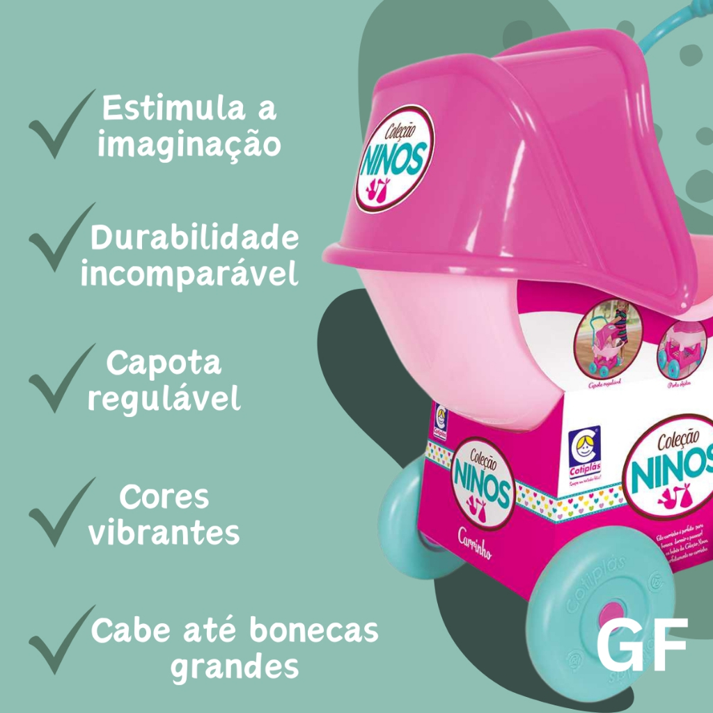 Carrinho de Boneca Coleção Ninos Para Passeio Meninas - Cotiplás O Carrinho de Boneca Coleção Ninos Para Passeio Meninas da Cotiplás é a escolha perfeita para quem busca um brinquedo funcional, seguro e divertido. Desenvolvido especialmente para bonecas grandes, como as Bonecas Reborn, esse carrinho permite que a criança leve sua boneca para passeios ou até mesmo para um descanso tranquilo. Com design robusto e material leve, oferece praticidade para as brincadeiras, tornando cada momento mais especial. Características e Benefícios: Design Robusto e Leve: Facilita a movimentação e o manuseio, tornando o brinquedo ideal para passeios e momentos de descanso da boneca. Capota Regulável: A capota ajustável proporciona sombra para a boneca, tornando o carrinho perfeito para todas as ocasiões. Compatível com a Coleção Ninos: Todos os bebês da Coleção Ninos cabem perfeitamente no carrinho, oferecendo mais versatilidade nas brincadeiras. Material Resistente: Feito de material durável, o carrinho é seguro e de fácil manutenção, permitindo que a criança brinque com ele por longos períodos. Seguro e Flexível: Não machuca a boca da criança, oferecendo uma experiência de brincadeira segura e divertida. Informações Técnicas: Produto: Carrinho de Boneca Coleção Ninos Para Passeio Meninas - Cotiplás Marca: Cotiplás Tipo: Brinquedo Infantil Sexo Específico: Feminino Itens Inclusos: 1 Carrinho de Boneca Coleção Ninos Para Passeio Meninas - Cotiplás Apresentação: Caixa de papelão Modo de Usar: Este carrinho é ideal para brincar com bonecas grandes, sendo usado como um brinquedo avulso para a criança. Precauções: Não indicado para crianças com menos de 3 anos de idade. Este brinquedo não substitui um mordedor para a criança. Perguntas Frequentes: O que fazer se meu filho(a) colocar o carrinho na boca? Sabemos que crianças pequenas têm a tendência de explorar objetos com a boca. Embora o carrinho não seja recomendado como mordedor, ele é feito de plástico seguro e não causará danos à saúde. Caso isso aconteça, recomenda-se a limpeza imediata da boca da criança. Qual é a idade recomendada para este carrinho? O carrinho é recomendado para crianças a partir de 3 anos. Adquira agora o Carrinho de Boneca Coleção Ninos Para Passeio Meninas - Cotiplás e leve para sua filha um brinquedo encantador, seguro e perfeito para criar momentos de diversão com suas bonecas. Produto disponível para envio imediato! -------------------------------------------------------------------------------- carrinho de boneca; carrinho de passeio para boneca; boneco; carrinho de boneca quatro rodas rosa; carrinho com capota regulável; carrinho rosa