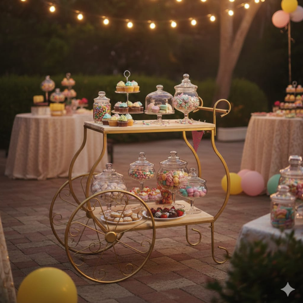 Carrinho Decorativo em Ferro Dourado com Prateleiras em Madeira – Elegância para Eventos e Decoração Transforme qualquer ambiente com este charmoso carrinho decorativo, perfeito para composições sofisticadas, mesas de doces, cantinhos temáticos e decoração de eventos. Seu design delicado combina a estrutura em ferro dourado com curvas elegantes e prateleiras em madeira natural, criando uma peça que se destaca pela beleza e versatilidade. Com rodas ornamentadas e acabamento refinado, o carrinho oferece duas prateleiras amplas, ideais para organizar doces, bebidas, arranjos, lembrancinhas ou itens decorativos. Além disso, sua estética romântica e atemporal combina perfeitamente com festas infantis, casamentos, chá revelação, chá de bebê, aniversários e também na decoração de casa ou loja. Diferenciais do Produto Estrutura em ferro com pintura dourada, garantindo charme e durabilidade. Madeira natural nas prateleiras, trazendo um toque rústico elegante. Duas prateleiras espaçosas para melhor organização dos itens. Design clássico com rodas decorativas que encantam em qualquer composição. Perfeito para eventos, buffets, festas e decoração permanente. Uso Ideal ✨ Mesa de doces ✨ Apoio para cupcakes e doceria ✨ Expositor de produtos ✨ Decoração de casamentos e festas ✨ Cantinho do café, drinks ou chá ✨ Ambientes internos e externos