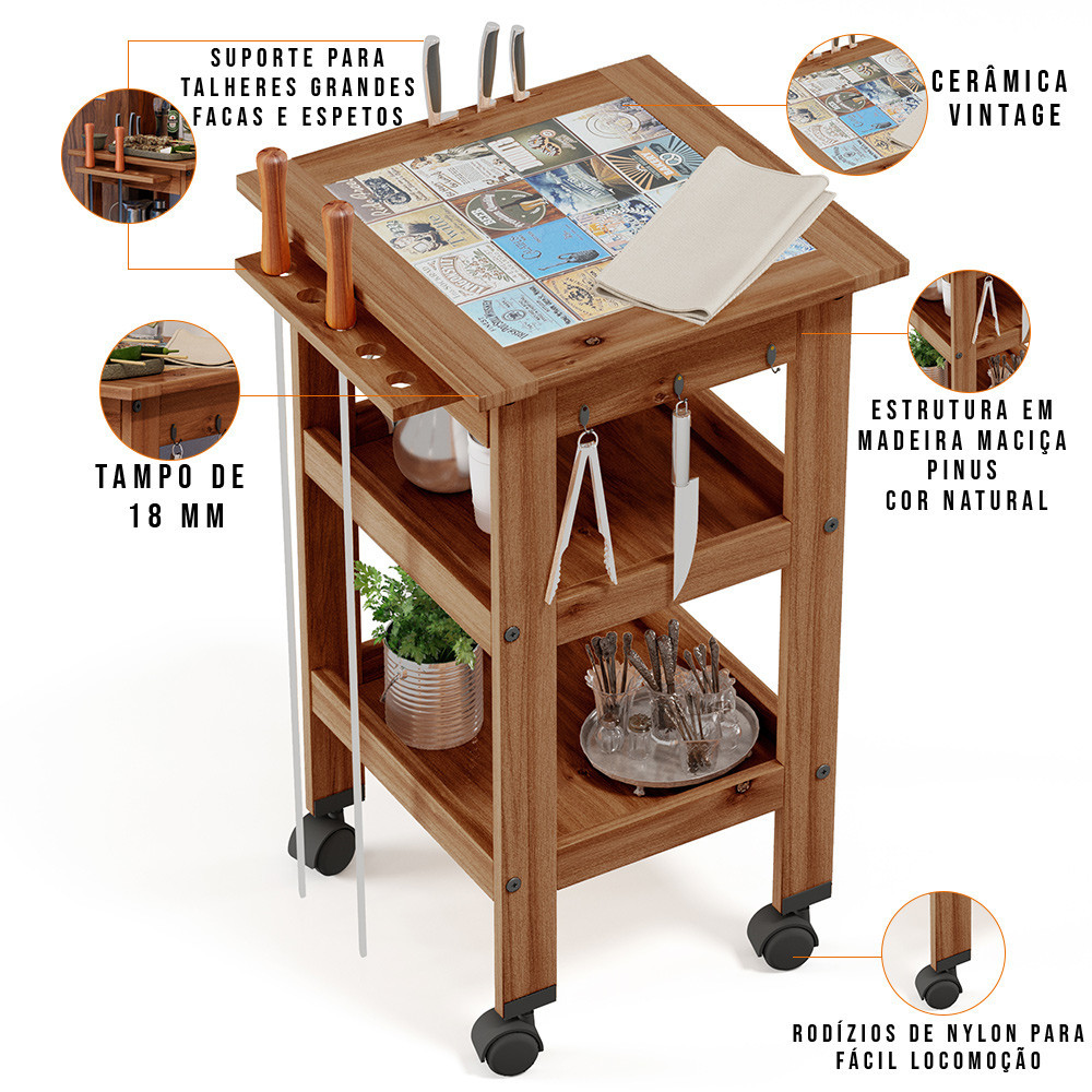 Carrinho de Churrasco Mesa Gourmet Bistrô Cerâmica Churrasqueira W02 Madeira Maciça Imbuia - Lyam Decor