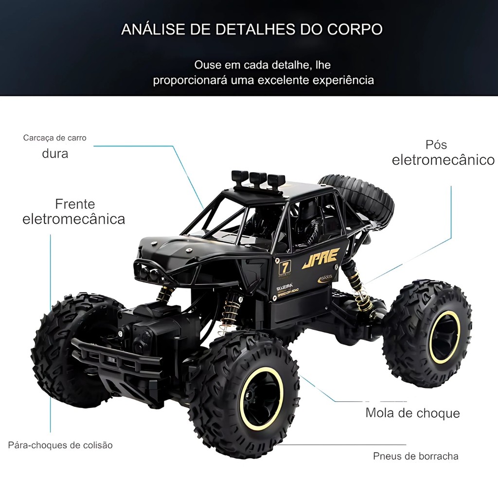 Carrinho de Controle Remoto Infantil X-Plore Car Replay Kids O Carrinho de Controle Remoto Infantil X-Plore Car da Replay Kids é a escolha perfeita para os pequenos aventureiros que adoram desafios off-road. Com sua construção robusta em liga metálica e escala 1:16, esse carro de escalada foi projetado para superar terrenos difíceis, garantindo uma experiência de condução emocionante. Ele opera em uma frequência de 40MHz e possui grandes pneus com tração nas quatro rodas, além de uma suspensão com molas que absorve impactos, proporcionando uma performance suave e estável. As funções de controle incluem avançar, recuar, virar à esquerda e à direita, permitindo total controle sobre o veículo. O carro é alimentado por uma potente bateria recarregável de lítio de 3.7V (1200mAh), que oferece até 50 minutos de diversão com uma única carga. Disponível nas cores preto e dourado, o X-Plore Car vem com acessórios como um cabo USB e um controle remoto (pilhas AA vendidas separadamente). Esse carrinho de controle remoto é ideal para quem busca durabilidade, potência e muita diversão em qualquer terreno. Principais Características: - Idade Recomendada: A Partir dos - 1:16 Carro de escalada de liga leve - Carro de escalada em liga metálica na escala 1:16 (inclui sistema elétrico). - Frequência de operação 40MHz. - Suspensão com molas para absorção de choque. - Pneus grandes com tração nas quatro rodas. - Funções de controle: avançar, recuar, virar à esquerda e à direita. - Bateria recarregável de 3.7V lítio (1200mAh de alta capacidade). - Tempo de uso: até 50 minutos por carga. - Acessórios: cabo USB e controle remoto (2 pilhas AA não incluídas). Especificações Técnicas: - Conteúdo da Embalagem: 01 Carrinho X-Plore + Acessórios - Composição/Material: ABS, Polipropileno e TPR - Dimensões do Carro: 19 x 18 x 38cm aprox. - Peso Líquido: 600g aprox. - Certificação INMETRO 009735/2024 - Garantia: 30 Dias (Contra Defeito de Fabricação Pelo Fabricante) - Referência do Fabricante: 21765 - EAN: 7899403217657 - Marca: Replay Kids Imagens meramente ilustrativas, as cores e estampas podem variar de acordo com o lote do fabricante.