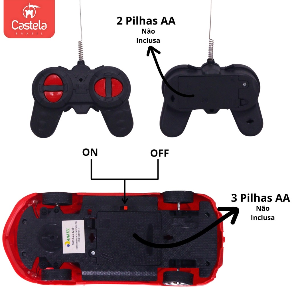 DESCRIÇÃO DO PRODUTO Carro de Controle Remoto com 4 Funções RC Escala 1:18 – Castela Prepare-se para muita velocidade e diversão com o Carro de Controle Remoto Castela! Com design moderno e detalhes incríveis, ele garante emoção em cada corrida. Fácil de controlar, possui 4 funções que permitem mover o carro para frente, para trás e fazer manobras em todas as direções. Ideal para crianças e apaixonados por carros, esse brinquedo proporciona momentos cheios de aventura e ação! Perfeito para presentear e colecionar. CARACTERÍSTICAS TÉCNICAS: Conteúdo da Embalagem: 01 Carrinho e 01Controle Remoto Dimensões Aproximadas da Embalagem: 10cm x 11cm x 29cm (Altura x Largura x Comprimento/Profundidade). Material/Composição: Plástico Idade Mínima Recomendada: A partir de 3 anos Participantes: A partir de 1 pessoa Alimentação: Carrinho: 3 pilhas AA Controle: 2 Pilhas AA - ( Não Inclusa ) Marca: Castela Brasil Referência: CBS0565 Outras informações: As cores podem variar entre as imagens mostradas acima e o produto. Imagens meramente ilustrativas. Aviso: As informações e imagens divulgadas são de total responsabilidade do fabricante/fornecedor. Produto lacrado e disponível a pronta entrega para todo Brasil! APROVADO PELO INMETRO