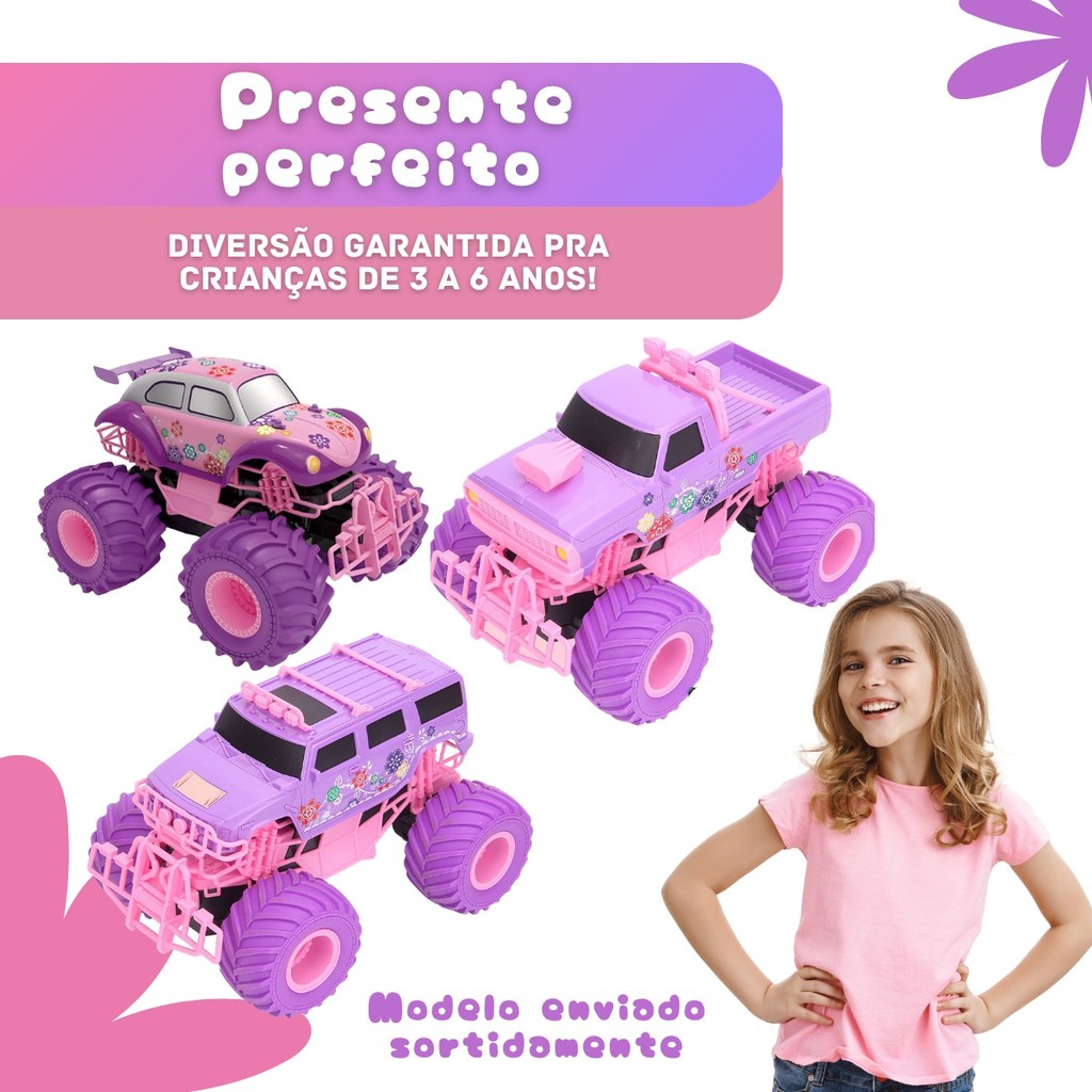 Carrinho De Controle Remoto Monster Truck Fusca Rosa Recarregável Jeep Infantil Brinquedo Off-Road Infantil Kizumba Carrinho De Controle Remoto Off Road Rosa Monster Truck Jeep Recarregável InfantilO Carrinho de Controle Remoto Monster Truck Rosa é a escolha ideal para crianças que adoram aventura e diversão com estilo! Com design robusto tipo Jeep, suspensão elevada e rodas grandes, ele é capaz de enfrentar terrenos diversos com facilidade. A cor rosa vibrante torna o brinquedo ainda mais atrativo, combinando potência com charme. Possui bateria recarregável e controle sem fio com ótimo alcance, permitindo manobras como giros, curvas radicais e movimento para frente e para trás. Fabricado em material resistente, é seguro e durável para brincadeiras em casa, no quintal ou em parques. Um presente incrível para surpreender em aniversários, promovendo coordenação motora e entretenimento saudável longe das telas. Perfeito para crianças a partir de 4 anos, o Monster Truck Rosa traz emoção e estilo em cada corrida. Acompanha carregador USB e controle remoto de fácil manuseio. Especificações Técnicas: • Cor: Rosa • Material: Plástico ABS resistente • Alimentação do Carrinho: Bateria recarregável (inclusa) • Alimentação do Controle: 2 pilhas AA (não inclusas) • Frequência: 2.4GHz • Funções: Frente, ré, esquerda, direita • Certificação: INMETRO Dimensões Aproximadas: • Comprimento: 23 cm • Largura: 17 cm • Altura: 15 cm FAQ – Perguntas Frequentes: 1. O carrinho vem com bateria? Sim, acompanha bateria recarregável para o carrinho e cabo USB para recarga. 2. Pilhas do controle remoto estão inclusas? Não, o controle funciona com 2 pilhas AA (não inclusas). 3. Pode ser usado em área externa? Sim! As rodas grandes permitem uso em pisos lisos, terra batida e grama. 4. É indicado para qual idade? Recomendado para crianças a partir de 4 anos com supervisão de um adulto. Conteúdo da Embalagem: 01 Carrinho Monster Truck Rosa 01 Controle Remoto 01 Bateria Recarregável 01 Cabo USB para carregamento Importante: Valor Unitário Imagens meramente ilustrativas Não nos responsabilizamos pelo mau uso do produto