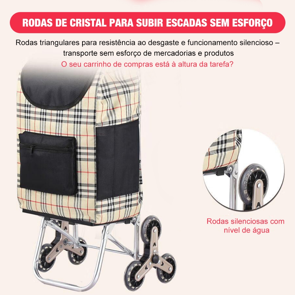 🛒 Carrinho de Compras Dobrável Reforçado Yesop 6 Rodas Sobe Escada • Com Assento • Bolsa Impermeável Cansado de carregar sacolas pesadas ou sofrer para subir escadas com compras? O Carrinho de Compras Premium Yesop foi desenvolvido para tornar sua rotina muito mais prática. Com estrutura reforçada, sistema de 6 rodas para subir escadas e assento integrado, ele é o aliado perfeito para transportar compras, caixas e até galões de água com muito menos esforço. Ideal para supermercado, feira, viagens, lavanderia ou transporte de cargas pesadas no dia a dia. ⭐ Principais Benefícios 🛞 Sistema de 6 Rodas “Cristal” – Sobe Escadas com Facilidade O design triangular das rodas permite que o carrinho suba degraus, escadas e calçadas sem precisar levantá-lo. Além disso, as rodas são silenciosas, resistentes e duráveis. 💺 Assento Integrado – Descanse Quando Precisar Precisa fazer uma pausa? O carrinho possui base dobrável reforçada que suporta o peso de um adulto, funcionando como um assento temporário prático em qualquer lugar. 🔒 Dupla Proteção Contra Quedas Muito mais segurança durante o transporte. ✔ Base estendida para maior estabilidade ✔ Cordões elásticos de fixação ✔ Mantém cargas estáveis a 90° Ideal para transportar galões de água de 20L, caixas ou compras pesadas. 🧍 Ergonomia e Conforto Com 97cm de altura e pega ergonômica dupla, o carrinho permite transportar cargas sem curvar as costas, evitando dores lombares. Perfeito para pessoas entre 1,50m e 1,90m. 💧 Bolsa Impermeável e Removível A bolsa elegante em tecido Oxford impermeável protege suas compras da chuva e ainda oferece bolsos extras para celular, carteira e objetos pessoais. ✔ Removível ✔ Fácil de limpar ✔ Alta durabilidade 📦 Especificações Técnicas Estrutura: Aço inoxidável reforçado Material da bolsa: Tecido Oxford impermeável de alta densidade Dimensões do carrinho: 97 cm (Altura) × 40 cm (Largura) × 32 cm (Profundidade) Dimensões da bolsa: 54 cm × 37 cm × 17 cm Capacidade: Ideal para cargas pesadas e volumosas Design: Dobrável para facilitar armazenamento no armário, carro ou porta-malas 📦 Conteúdo da Embalagem ✔ 1x Estrutura de Carrinho Dobrável com 6 Rodas ✔ 1x Bolsa de Compras Impermeável Removível ❓ Perguntas Frequentes Ele suporta galão de água? Sim. O carrinho foi projetado para transportar galões de até 20L, com base reforçada e elásticos de fixação. É difícil de montar? Não. A montagem é rápida e simples, levando apenas alguns minutos. Ele ocupa muito espaço? Não. O carrinho é totalmente dobrável, facilitando o armazenamento. ✅ Mais praticidade para suas compras ✅ Menos esforço para carregar peso ✅ Ideal para escadas e terrenos irregulares 🛍️ Garanta agora o seu Carrinho Yesop e transforme sua rotina!